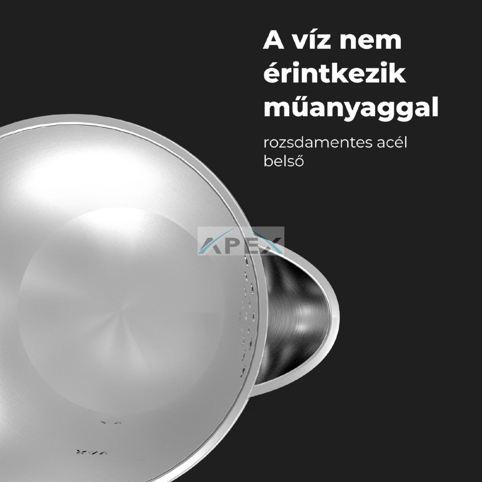 A rozsdamentes acél szűrő segít a lerakódások, vízkő és egyéb szennyeződések kiszűrésében. Mivel a víz nem érintkezik műanyaggal, az itt forralt ital mindig tiszta, ízmentes marad.