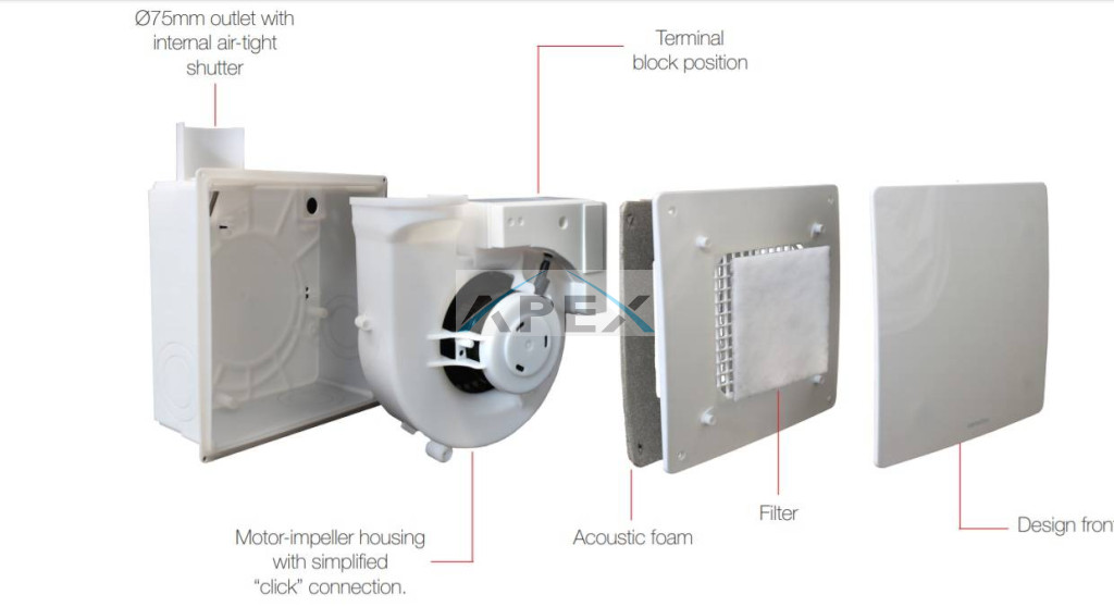 Az Aerauliqa QXD szellőztető ventilátorok formatervezett, könnyen levehető és tisztítható előlappal, zajszigeteléssel, valamint a ventilátort védő, szintén tisztítható szűrővel rendelkeznek. A süllyesztett kialakításnak köszönhetően, csekély mértékű a falsíktól való kiállásuk.