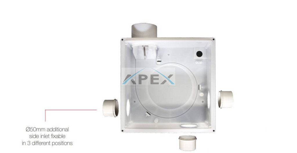 A ventilátor 1 db 80 mm átmérőjű légtechnikai csőrendszerhez illeszthető, valamint plusz 1 db mellékelszívást biztosító 50 mm átmérőjű csőhöz illeszthető oldalsó csőcsatlakozással rendelkezik. Ez utóbbi csatlakozási mód lehetővé teszi azt hogy a helyiség ventilátoros szellőztetésével egyidőben,közvetlenül a WC csészén keresztül is megvalósítható legyen a szagelszívás. Az 50 mm-es csőcsonk a termék dobozában külön megtalálható és egyszerűen a ventilátorházhoz illeszthető.