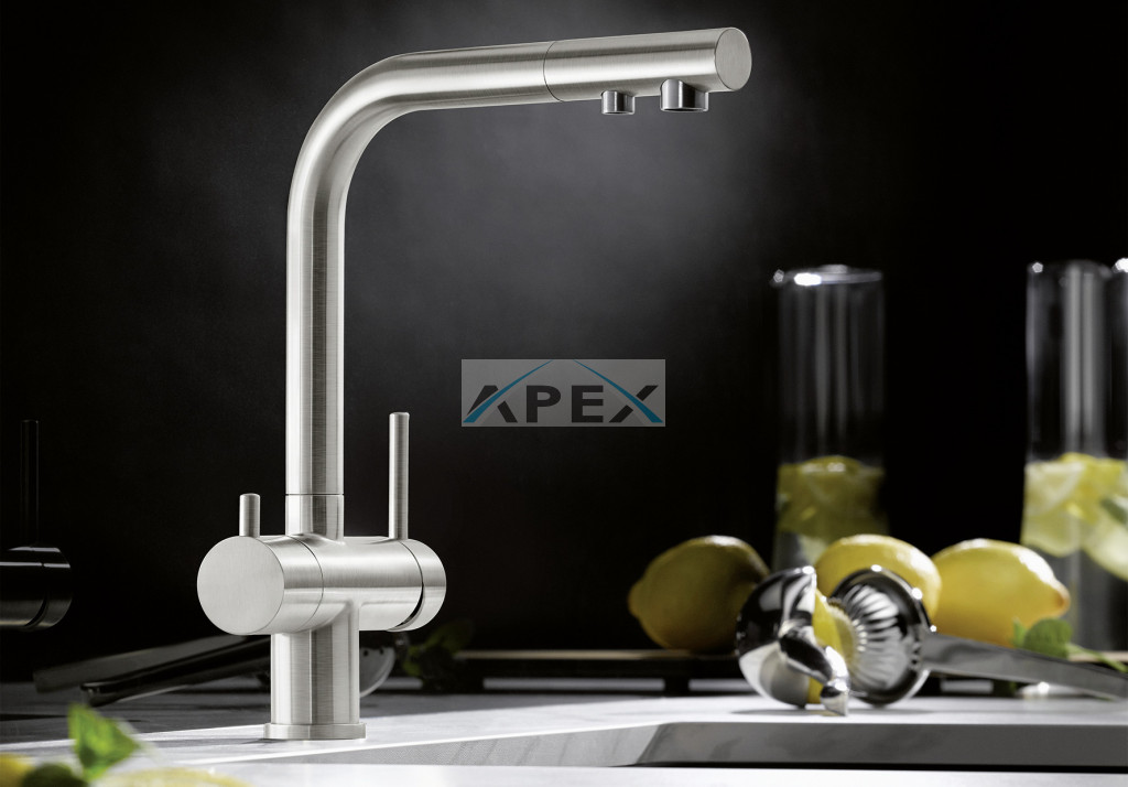 • Kényelmes, 3 az 1-ben csaptelep: a jobb oldali keverőkarral a hideg és meleg vizet lehet szabályozni, a bal oldali karral a szűrt vizet