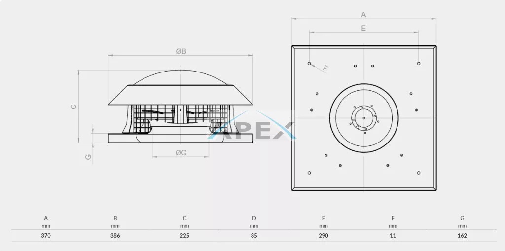 A BRF sorozatú vízszintes kifúvású centrifugál tetőventilátorok szerelőlemeze és ventilátorsapkája elektrosztatikusan porszórt fémlemezből készült. A BRF modellek járókerekei kiváló minőségű, korrózióálló, horganyzott acéllemezből készülnek.  Minden modell külső forgórészes, zárt szerkezetű motorral rendelkezik. A ventilátor segítségével elszívott levegő hőmérséklete max. 40ºC lehet.