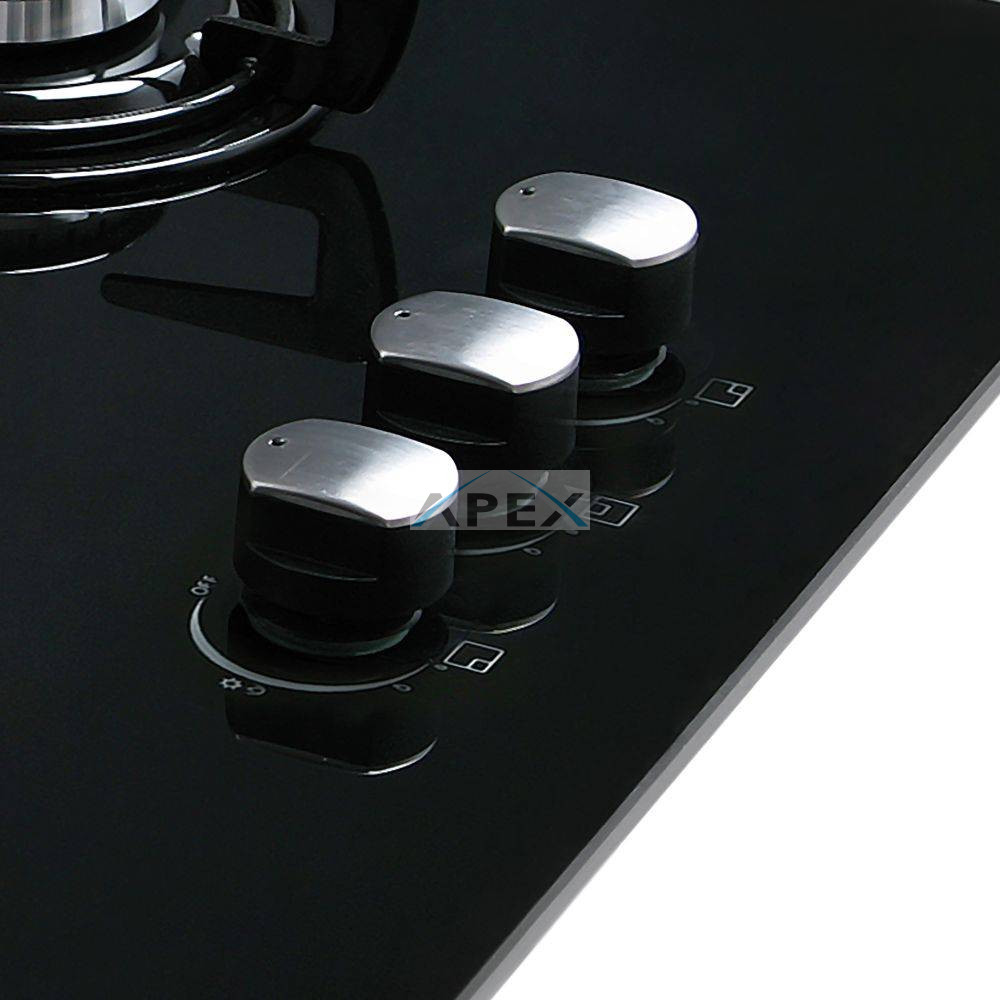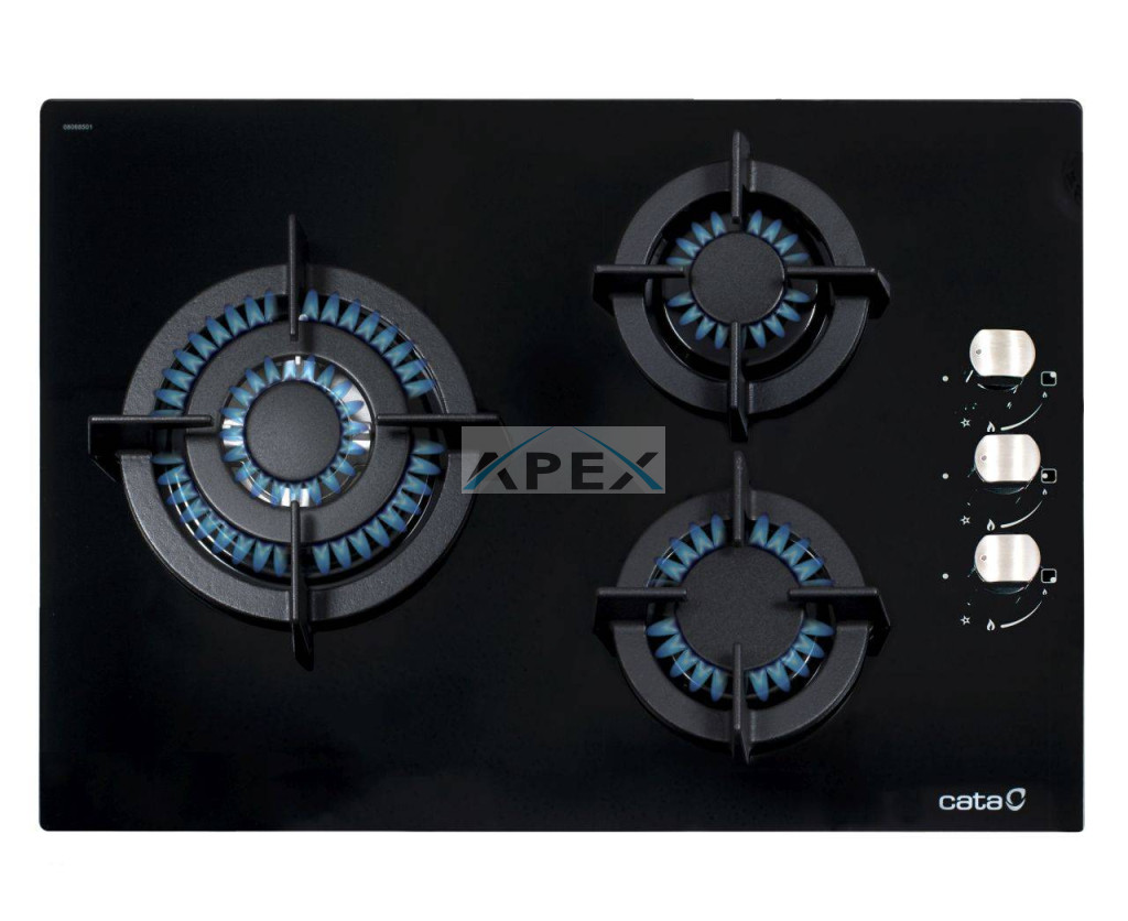 3 gázégő égésbiztosítóval, automata szikragyújtás, fekete üveg felület, öntöttvas rács, teljesítmény: 6,25 kW, 1 db közepes gázégő - 1,75 kW, 1 db tripla koronás WOK gázégő - 3,5 kW, 1 db normál gázégő - 1 kW