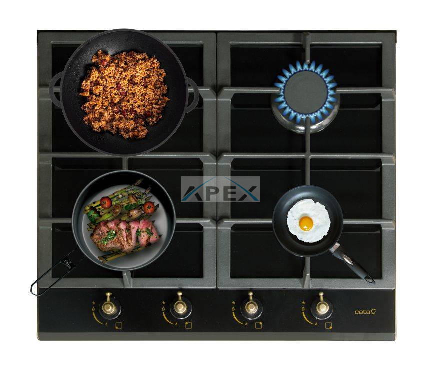 4 gázégő égésbiztosítóval, automata szikragyújtás, fekete felület, öntöttvas rács, teljesítmény: 8,1 kW, 2 db közepes gázégő - 2x1,75 kW, 1 db tripla koronás WOK égő - 3,5 kW, 1 db nagy égő - 3 kW, 1 db normál égő - 1 kW