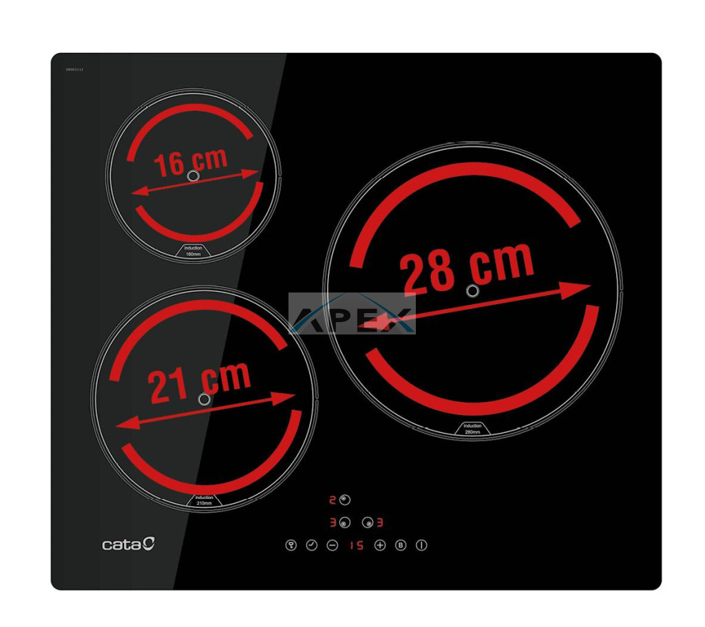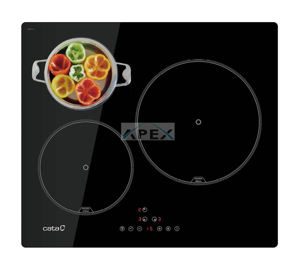 3 Indukciós főzőzóna, MACH2 indukciós technológia, Touch Control érintővezérlés, 9 fokozat, 1 db 28 cm-es, 1 db 21 cm-es és 1 db 16 cm-es főzőzóna, minden főzőzóna BOOSTER funkcióval, 3 főzési funkció: olvasztás (45-55ºC), melegítés, melegen tartás (65-70 ºC), forralás (85-95ºC), gyerekzár, időzítő, maradékhő kijelzés, Quick-Fix system, teljesítmény: 7,1 kW