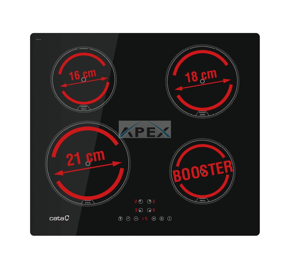 4 Indukciós főzőzóna, MACH2 indukciós technológia, Touch Control érintővezérlés, 9 fokozat, 2 db 16 cm-es, 1 db 18 cm-es és 1 db 21 cm-es főzőzóna, minden főzőzóna BOOSTER funkcióval, 3 főzési funkció: olvasztás (45-55ºC), melegítés, melegen tartás (65-70 ºC), forralás (85-95ºC), gyerekzár, időzítő, maradékhő kijelzés, automata kapcsolat, Quick-Fix system, teljesítmény: 7 kW