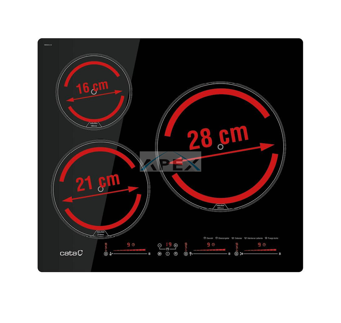 3 Indukciós főzőzóna, MACH2 indukciós technológia, Touch Control érintővezérlés, 9 fokozat, 1 db 28 cm-es, 1 db 21 cm-es és 1 db 16 cm-es főzőzóna, minden főzőzóna BOOSTER funkcióval, 3 főzési funkció: olvasztás (45-55ºC), melegítés, melegen tartás (65-70 ºC), forralás (85-95ºC), gyerekzár, időzítő, maradékhő kijelzés, Quick-Fix system, teljesítmény: 7,1 kW