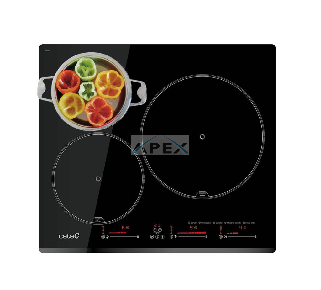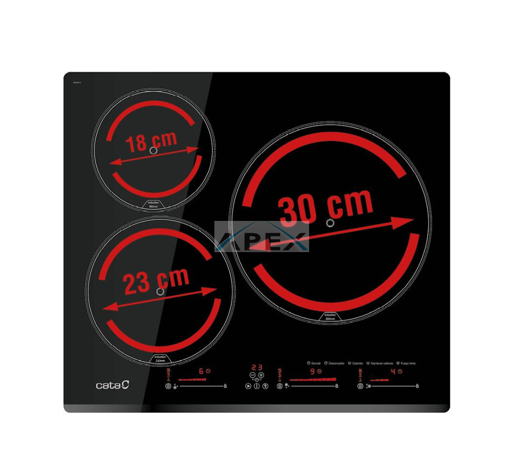 3 Indukciós főzőzóna, MACH2 indukciós technológia, Touch Control érintővezérlés, 9 fokozat, 1 db 30 cm-es, 1 db 23 cm-es és 1 db 18 cm-es főzőzóna, minden főzőzóna BOOSTER funkcióval, 3 főzési funkció: olvasztás (45-55ºC), melegítés, melegen tartás (65-70 ºC), forralás (85-95ºC), gyerekzár, időzítő, maradékhő kijelzés, Quick-Fix system, teljesítmény: 7,1 kW