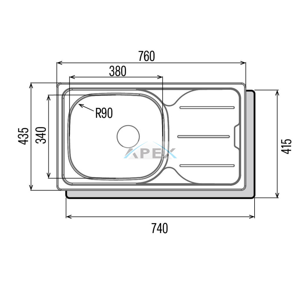 Az egymedencés kialakítás mellé praktikus csepegtetőfelület társul, így a mosogatás minden mozzanata kényelmesen és rendezetten végezhető. A bal oldalon elhelyezett medence 150 mm-es mélysége ideálissá teszi a nagyobb edények, serpenyők tisztításához is. A 760x435 mm-es teljes tálcaméret elegendő helyet biztosít a mindennapi használathoz, miközben helytakarékos megoldás marad a kisebb konyhákban is. A finoman ívelt, R90-es sarokkialakítás megkönnyíti a vízelvezetést, és egyszerűsíti a tisztítást.