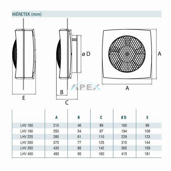 A Cata LHV nagy teljesítményű szellőztető ventilátorok hagyományos kialakítású, védőráccsal szerelt előlappal, nagy hatékonyságú, alacsony zajszintű lapátozással rendelkeznek. Kiválóan alkalmas nagyobb helyiségek általános szellőztetésre.