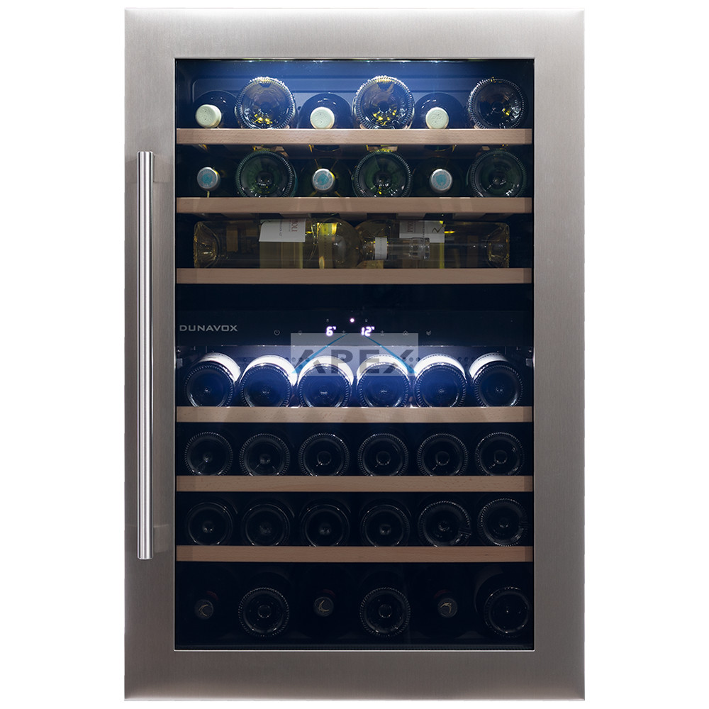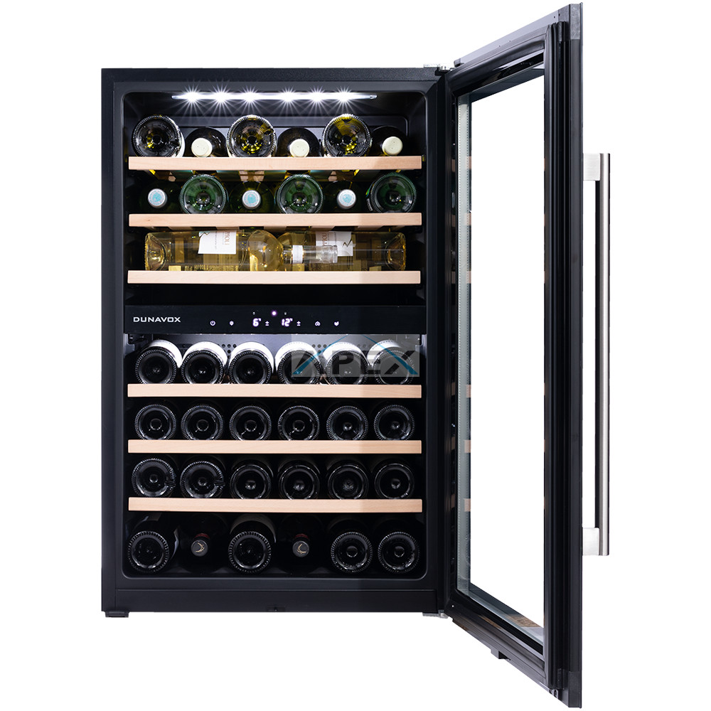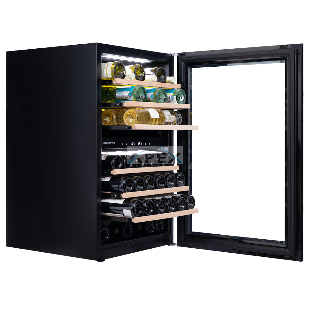 Kétszekciós, 42 palackos beépíthető modell. A DUNAVOX Soul-42 elegáns, igényes belső és külső kialakításával és a rozsdamentes acél fogantyújával teszi igazán mutatóssá a modern konyhákat. A palackok tömör bükkfa polcokon helyezhetőek el, melyeket fehér, borostyánsárga vagy kék LED világítás ölelhet körül. A felső zóna mindig legyen hidegebb, mint az alsó zóna. Felhívjuk figyelmét, hogy ez a modell egy beépített egység, amelyet konyhaszekrénybe terveztek, szabadon állóként és pult alatti beépítésre nem használható. Ez a készülék hátsó szellőzést igényel, és a lábazaton szellőző rácsot kell kialakítani. Ez elengedhetetlen, mivel nélküle a borhűtő nem lesz képes megfelelően működni.
