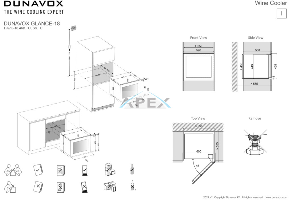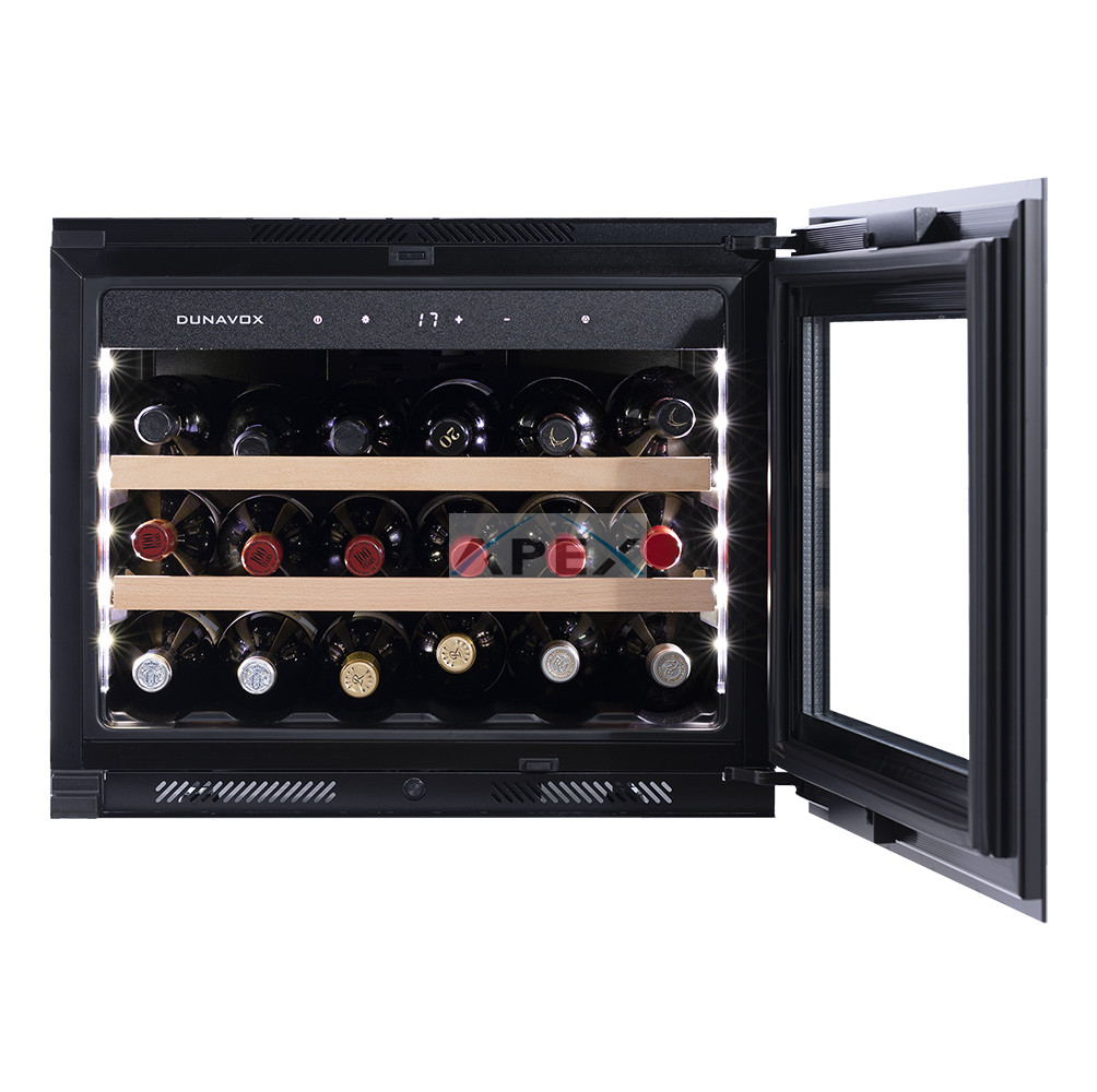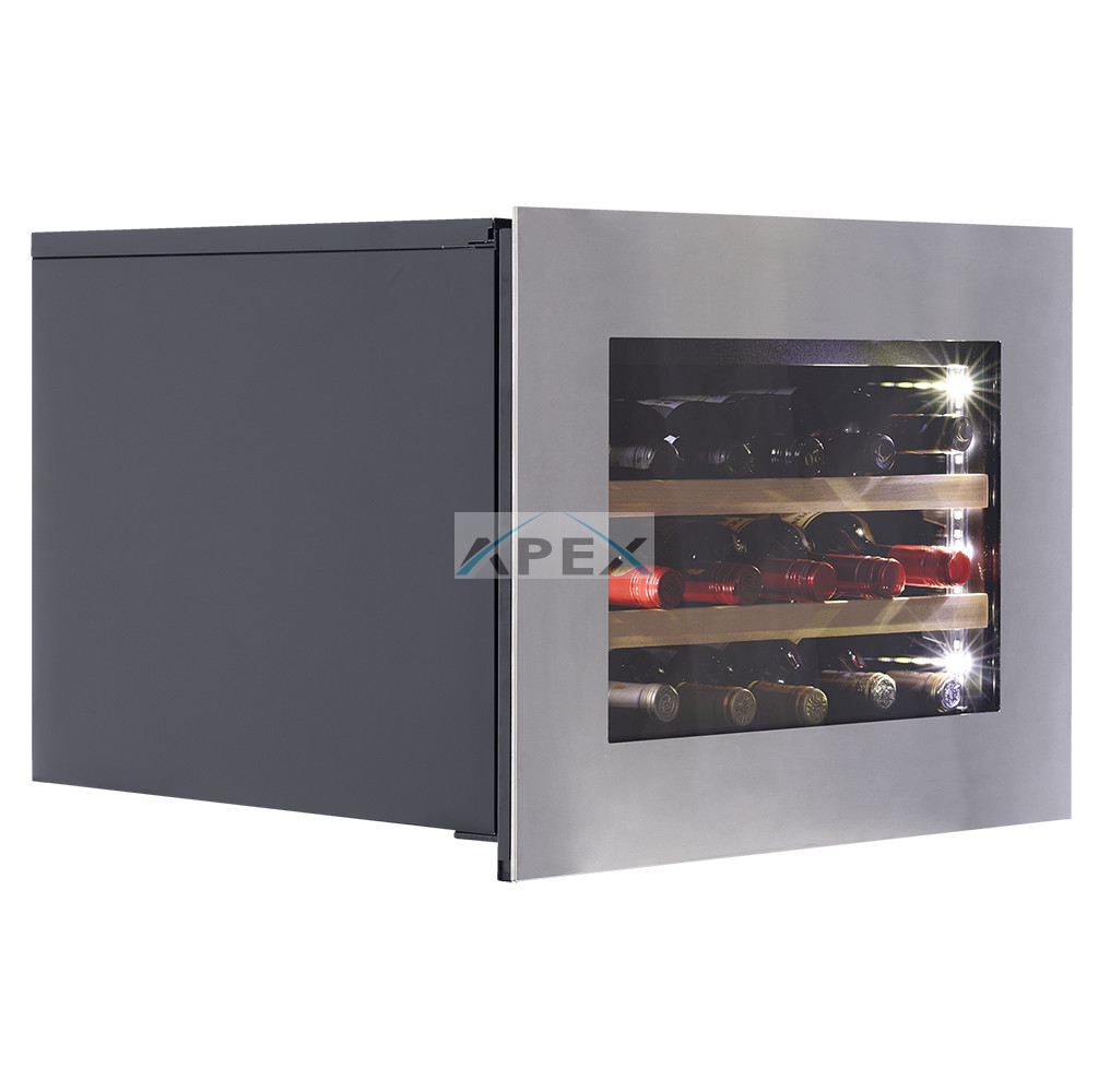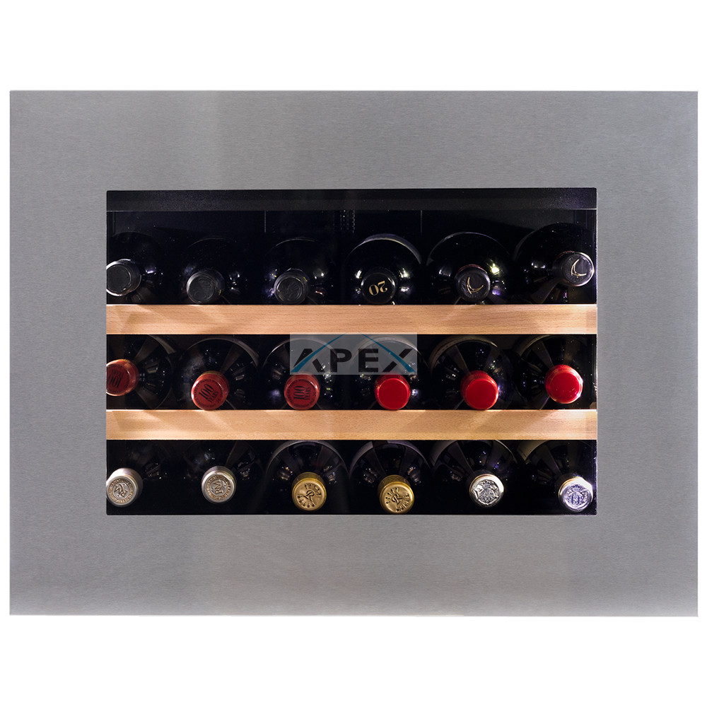 Egyszekciós, 18 palackos beépíthető modell, amely integrált szellőzéssel rendelkezik. Igényes belső és külső kialakításával és a „push-to-open” technológiával elengedhetetlen része minden modern konyhának. A színezett üvegajtó felső sarkának megnyomásával nyitható, így biztosítva hozzáférést a tömör bükkfa polcokon fekvő palackokhoz. Borait fehér, borostyánsárga vagy kék LED világítás ölelheti körül. Felhívjuk figyelmét, hogy ez a modell egy beépített egység, amelyet konyhaszekrénybe vagy pult alatti beépítésre terveztek, szabadon állóként nem használható.
