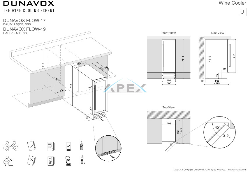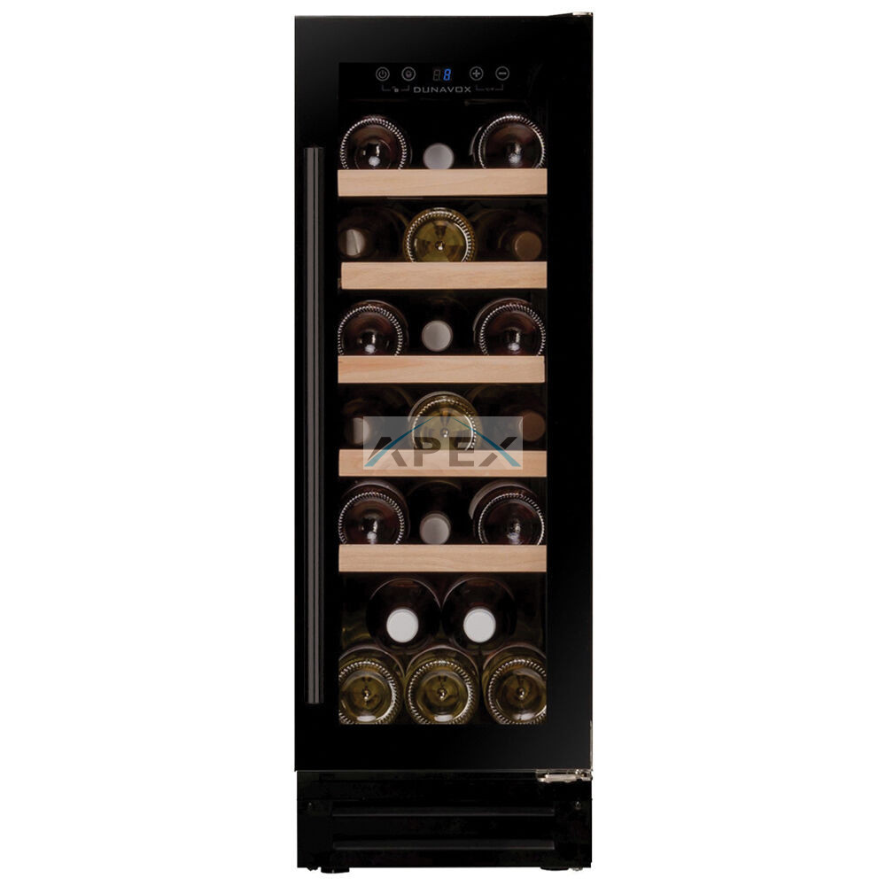 Egyszekciós, 19 palackos pult alá építhető modell. A DUNAVOX Flow-19 elegáns, igényes belső és külső kialakításával és a rozsdamentes acél fogantyújával teszi igazán mutatóssá a modern konyhákat. A palackok tömör fa polcokon helyezhetőek el, melyeket kék LED világítás ölel körül. Felhívjuk figyelmét, hogy ez a modell egy beépített egység, amelyet pult alá terveztek.