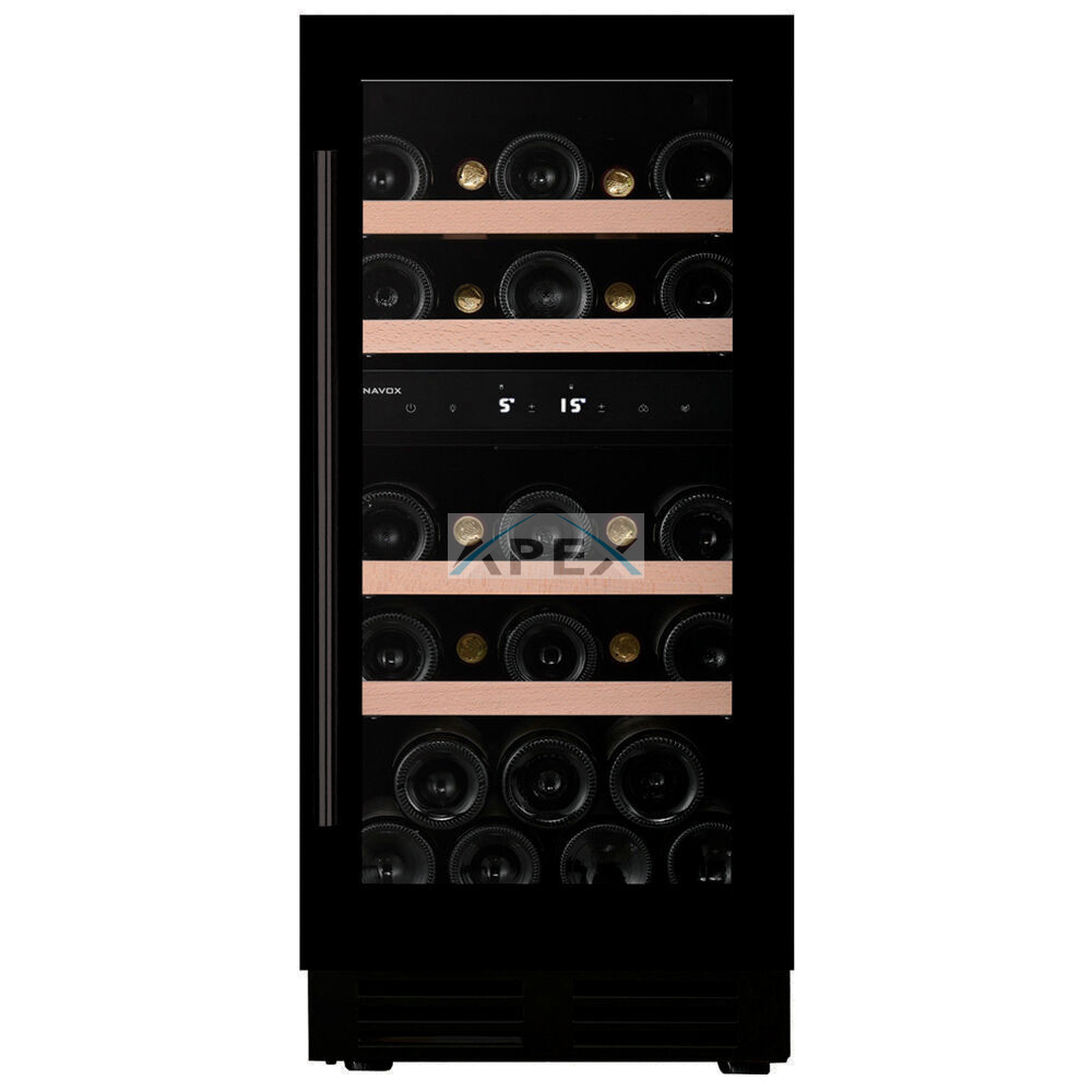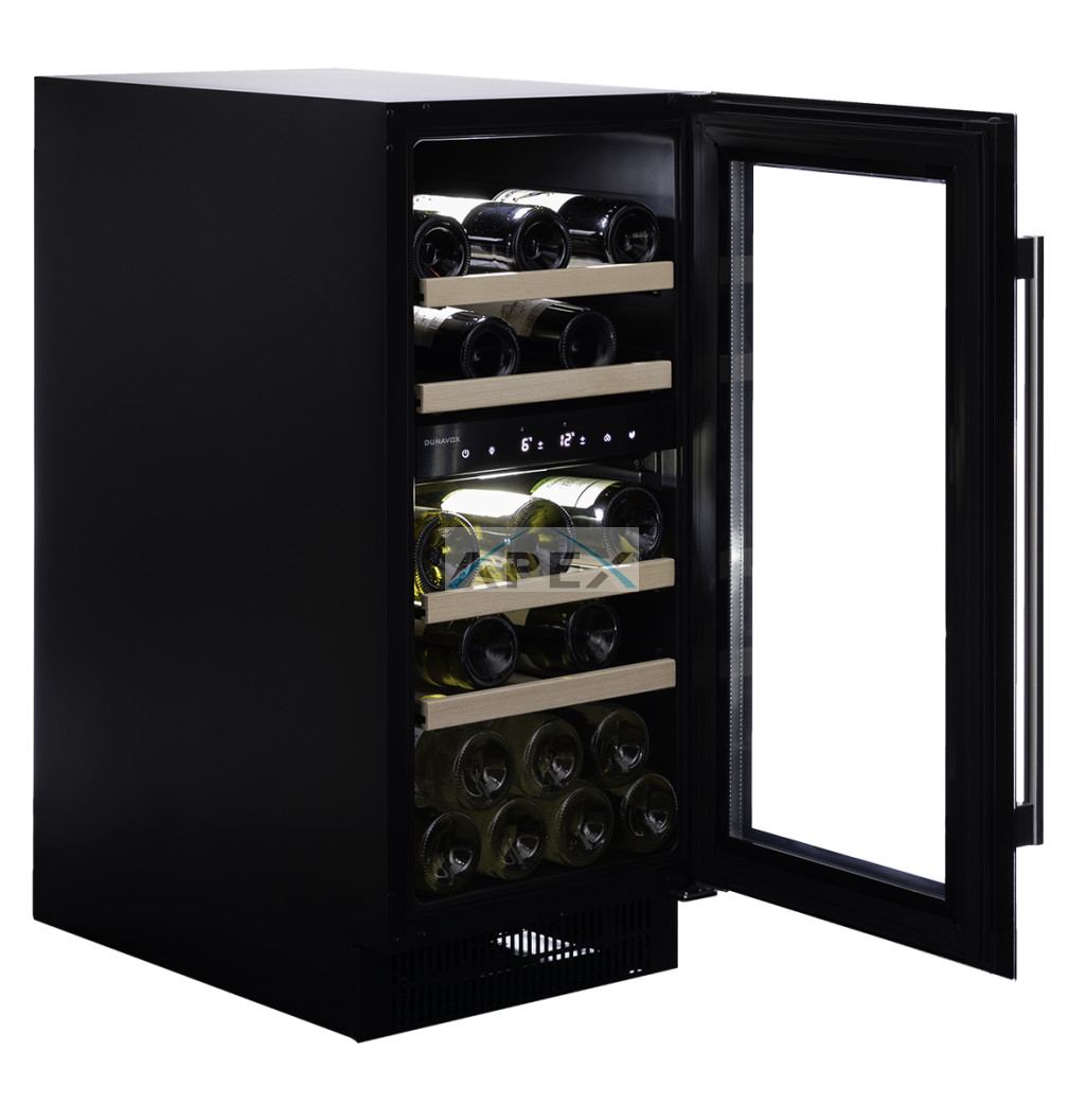 Kétszekciós, 32 palackos pult alá építhető modell. A DUNAVOX Flow-32D elegáns, igényes belső és külső kialakításával és a rozsdamentes acél fogantyújával teszi igazán mutatóssá a modern konyhákat. A palackok tömör fa polcokon helyezhetőek el, melyeket fehér, borostyánsárga vagy kék LED világítás ölelhet körül. Az alsó zóna mindig legyen hidegebb, mint az felső zóna. Felhívjuk figyelmét, hogy ez a modell egy beépített egység, amelyet pult alá terveztek.