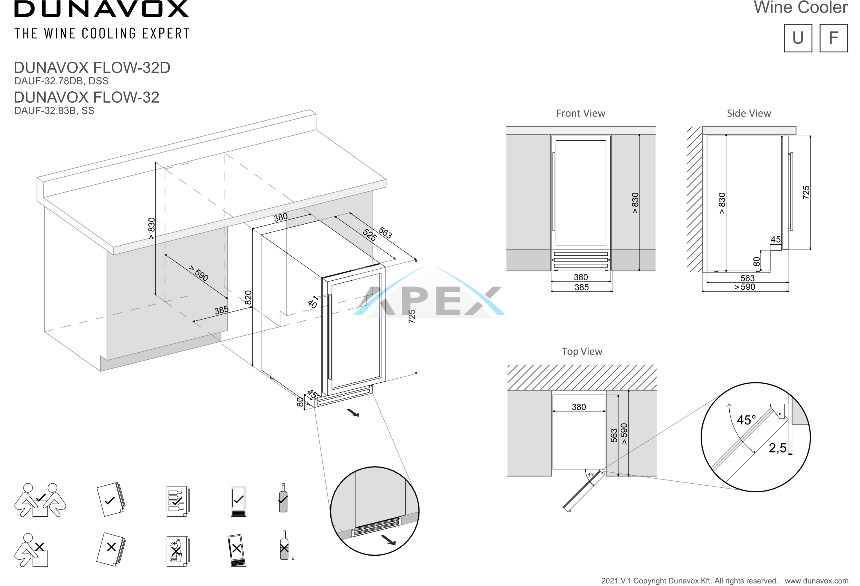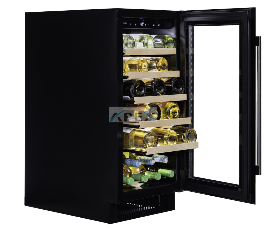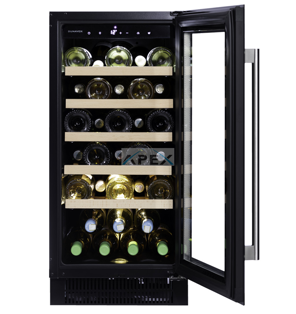 Egyszekciós, 32 palackos pult alá építhető modell. A DUNAVOX Flow-32 elegáns, igényes belső és külső kialakításával és a rozsdamentes acél fogantyújával teszi igazán mutatóssá a modern konyhákat. A palackok tömör fa polcokon helyezhetőek el, melyeket fehér, borostyánsárga vagy kék LED világítás ölelhet körül. Felhívjuk figyelmét, hogy ez a modell egy beépített egység, amelyet pult alá terveztek.