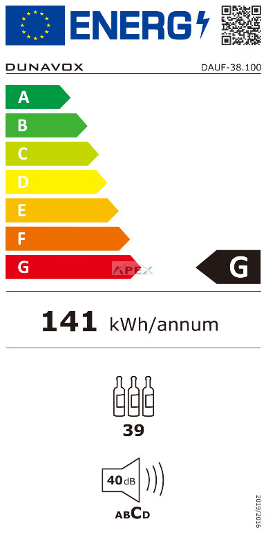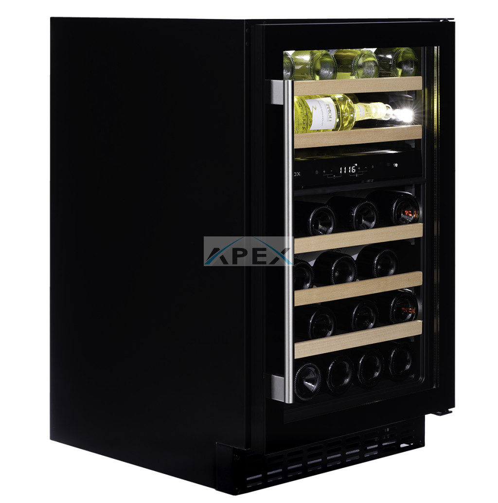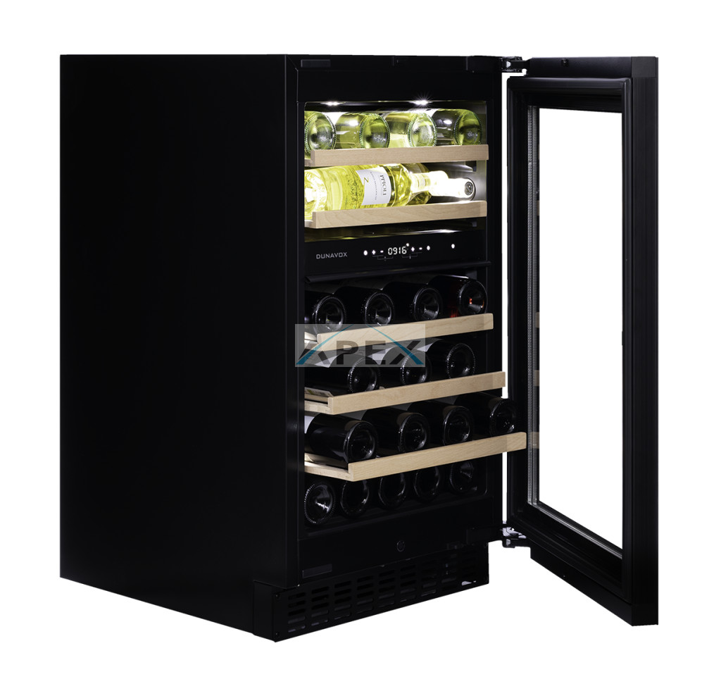 Kétszekciós, 38 palackos integrált modell. A DUNAVOX Flow-38 elegáns, igényes belső és külső kialakításával és a rozsdamentes acél fogantyújával teszi igazán mutatóssá a modern konyhákat. A palackok tömör bükkfa polcokon helyezhetőek el, melyeket fehér, borostyánsárga vagy kék LED világítás ölelhet körül. A felső zóna mindig legyen hidegebb, mint az alsó zóna, az ajánlott hőmérsékletkülönbség 4°C. Felhívjuk figyelmét, hogy ez a modell egyaránt építhető pult alá, vagy használható szabadon álló borhűtőként.