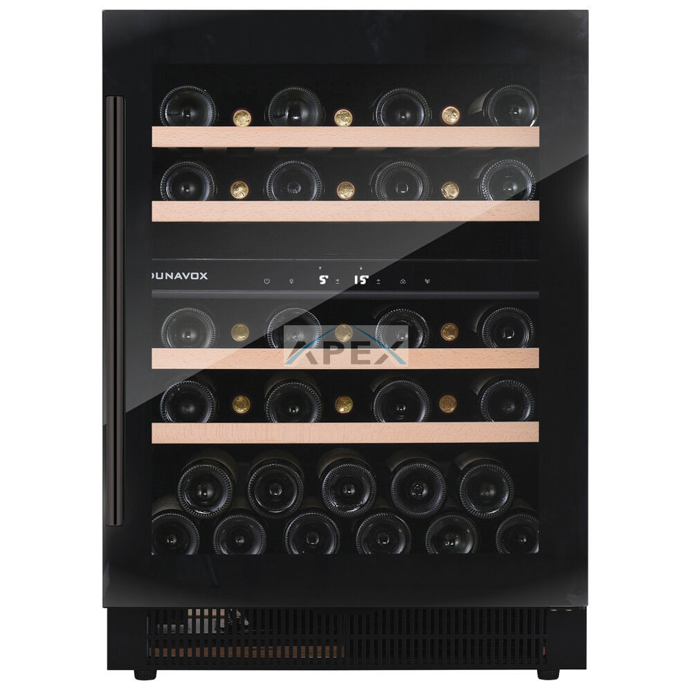 Kétszekciós, 39 palackos pult alá építhető modell. Az egyik legnépszerűbb pult alá építhető borhűtő újra tervezett változata. A DUNAVOX Flow-39 elegáns, igényes belső és külső kialakításával és a rozsdamentes acél fogantyújával teszi igazán mutatóssá a modern konyhákat. A palackok tömör fa polcokon helyezhetőek el, melyeket fehér, borostyánsárga vagy kék LED világítás ölelhet körül. A felső zóna mindig legyen hidegebb, mint az alsó zóna. Felhívjuk figyelmét, hogy ez a modell egy beépített egység, amelyet pult alá terveztek.