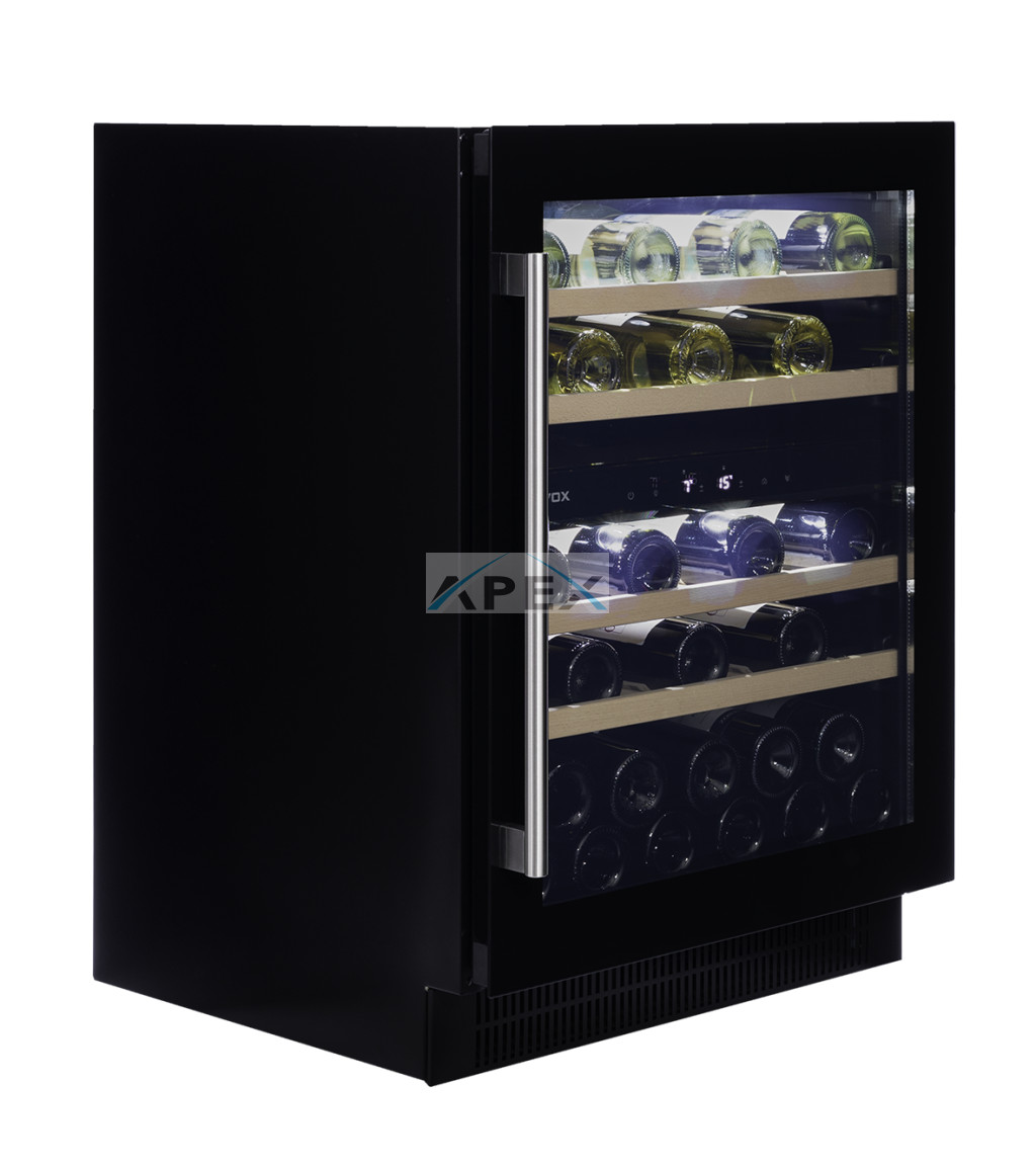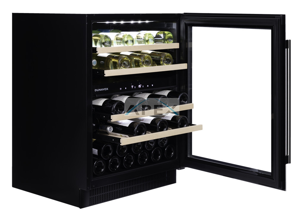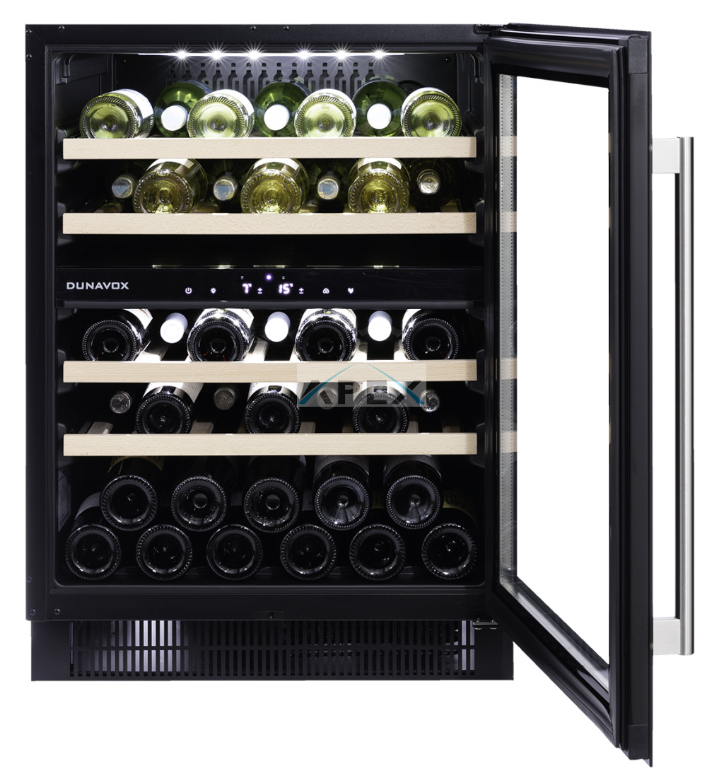 Kétszekciós, 39 palackos pult alá építhető modell. Az egyik legnépszerűbb pult alá építhető borhűtő újra tervezett változata. A DUNAVOX Flow-39 elegáns, igényes belső és külső kialakításával és a rozsdamentes acél fogantyújával teszi igazán mutatóssá a modern konyhákat. A palackok tömör fa polcokon helyezhetőek el, melyeket fehér, borostyánsárga vagy kék LED világítás ölelhet körül. A felső zóna mindig legyen hidegebb, mint az alsó zóna. Felhívjuk figyelmét, hogy ez a modell egy beépített egység, amelyet pult alá terveztek.