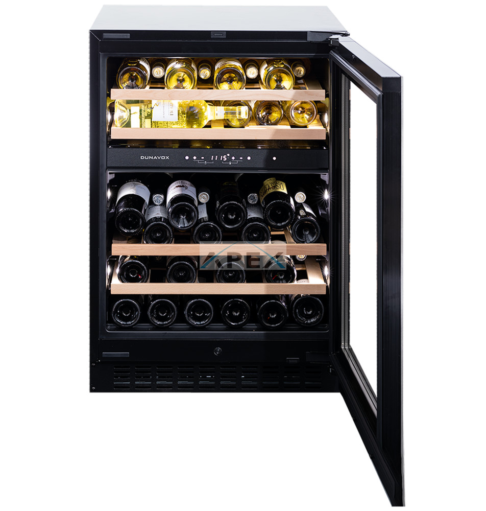 Kétszekciós, 45 pult alá építhető modell. Igényes belső és külső kialakításával és a „push-to-open” technológiával elengedhetetlen része minden modern konyhának. A színezett üvegajtó felső sarkának megnyomásával nyitható, így biztosítva hozzáférést a tömör bükkfa polcokon fekvő palackokhoz. Borait fehér, borostyánsárga vagy kék LED világítás ölelheti körül. A felső zóna mindig legyen hidegebb, mint az alsó zóna, az ajánlott hőmérsékletkülönbség 4°C. Felhívjuk figyelmét, hogy ez a modell egy beépített egység, amelyet pult alá terveztek.