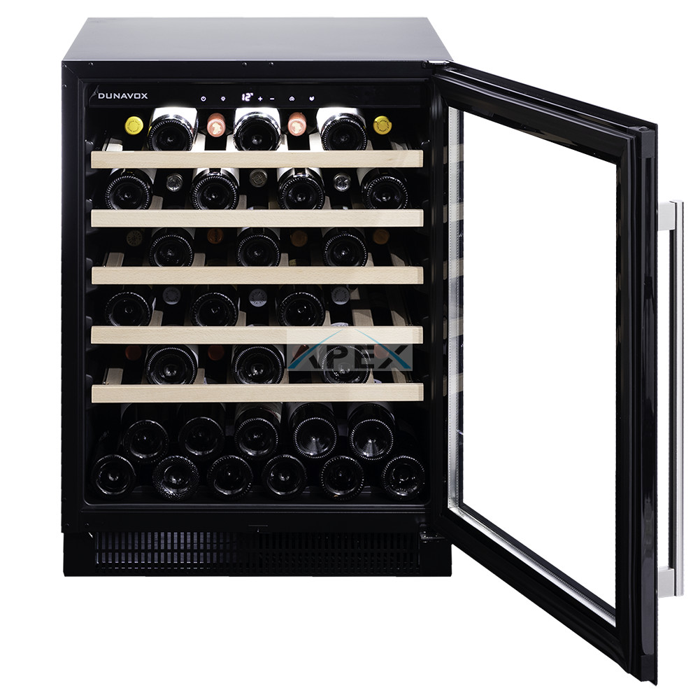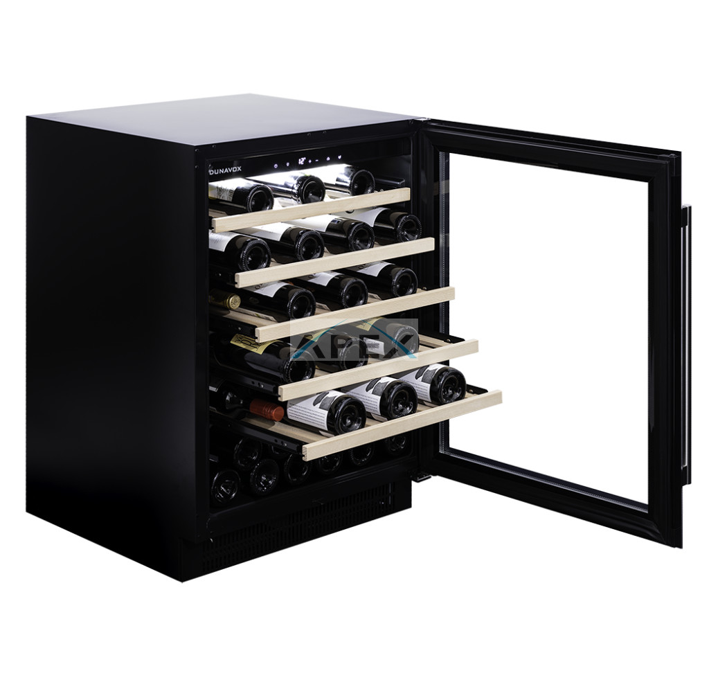 Egyszekciós, 46 palackos pult alá építhető modell. Az egyik legnépszerűbb pult alá építhető borhűtő újra tervezett változata. A DUNAVOX Flow-46 elegáns, igényes belső és külső kialakításával és a rozsdamentes acél fogantyújával teszi igazán mutatóssá a modern konyhákat. A palackok tömör fa polcokon helyezhetőek el, melyeket fehér, borostyánsárga vagy kék LED világítás ölelhet körül. Felhívjuk figyelmét, hogy ez a modell egy beépített egység, amelyet pult alá terveztek.