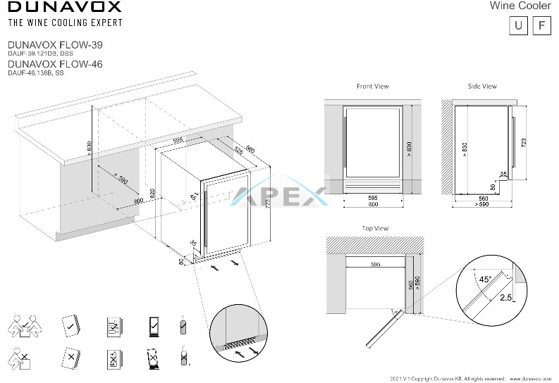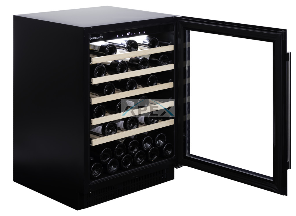Egyszekciós, 46 palackos pult alá építhető modell. Az egyik legnépszerűbb pult alá építhető borhűtő újra tervezett változata. A DUNAVOX Flow-46 elegáns, igényes belső és külső kialakításával és a rozsdamentes acél fogantyújával teszi igazán mutatóssá a modern konyhákat. A palackok tömör fa polcokon helyezhetőek el, melyeket fehér, borostyánsárga vagy kék LED világítás ölelhet körül. Felhívjuk figyelmét, hogy ez a modell egy beépített egység, amelyet pult alá terveztek.