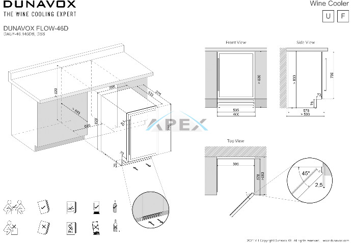Kétszekciós, 46 palackos pult alá építhető modell. A DUNAVOX Flow-46D elegáns, igényes belső és külső kialakításával, rejtett fogantyúval és LCD kijelzőjével teszi igazán mutatóssá a modern konyhákat. A palackok teleszkópos fa polcokon helyezhetőek el, melyeket fehér, borostyánsárga vagy kék LED világítás ölelhet körül. A felső zóna mindig legyen hidegebb, mint az alsó zóna. Felhívjuk figyelmét, hogy ez a modell egy beépített egység, amelyet pult alá terveztek.