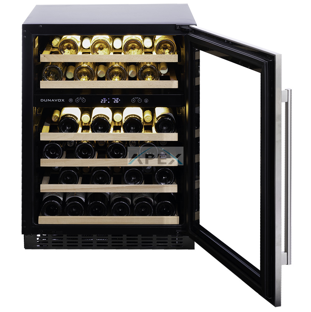 Kétszekciós, 46 palackos pult alá építhető modell. A DUNAVOX Flow-46D elegáns, igényes belső és külső kialakításával, rozsdamentes acél fogantyújával és LCD kijelzőjével teszi igazán mutatóssá a modern konyhákat. A palackok teleszkópos fa polcokon helyezhetőek el, melyeket fehér, borostyánsárga vagy kék LED világítás ölelhet körül. A felső zóna mindig legyen hidegebb, mint az alsó zóna. Felhívjuk figyelmét, hogy ez a modell egy beépített egység, amelyet pult alá terveztek.