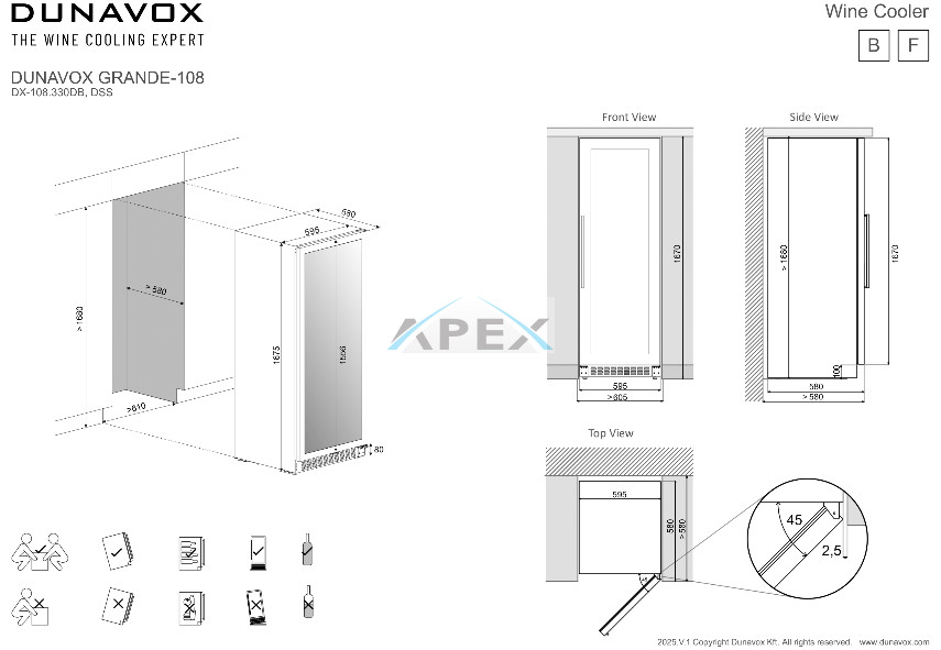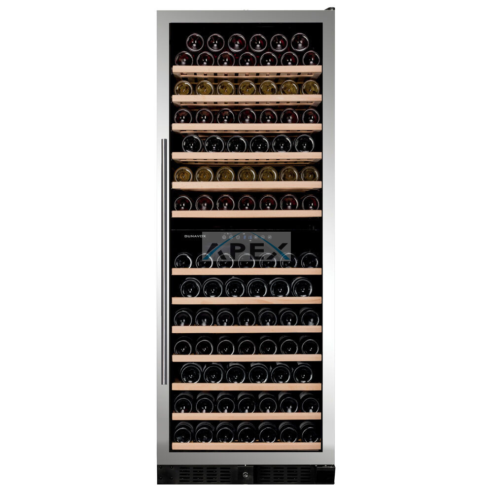 Kétszekciós, 108 palackos szabadon álló modell a Dunavox Grande sorozatból. A DUNAVOX Grande-108 elegáns, igényes belső és külső kialakításával – az SDSK változat rozsdamentes acél, a fekete pedig süllyesztett fogantyújával teszi igazán mutatóssá a modern konyhákat. A palackok tömör fa polcokon helyezhetőek el, melyeket kék LED világítás ölel körül. A felső zóna mindig legyen hidegebb, mint az alsó zóna. Felhívjuk figyelmét, hogy ez a modell egyaránt építhető konyhabútorba, vagy használható szabadon álló borhűtőként.