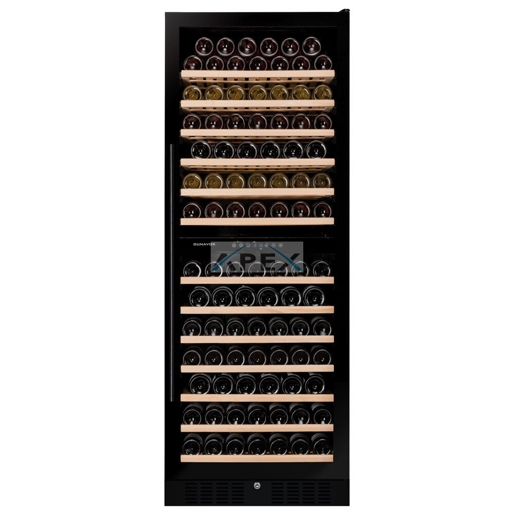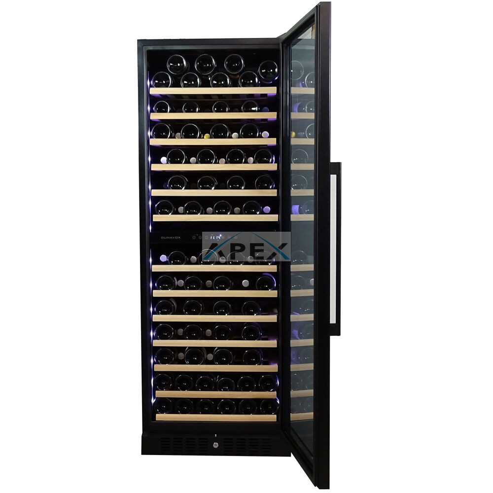 Kétszekciós, 108 palackos szabadon álló modell a Dunavox Grande sorozatból. A DUNAVOX Grande-108 elegáns, igényes belső és külső kialakításával – az SDSK változat rozsdamentes acél, a fekete pedig süllyesztett fogantyújával teszi igazán mutatóssá a modern konyhákat. A palackok tömör fa polcokon helyezhetőek el, melyeket kék LED világítás ölel körül. A felső zóna mindig legyen hidegebb, mint az alsó zóna. Felhívjuk figyelmét, hogy ez a modell egyaránt építhető konyhabútorba, vagy használható szabadon álló borhűtőként.