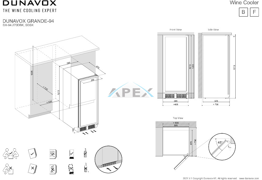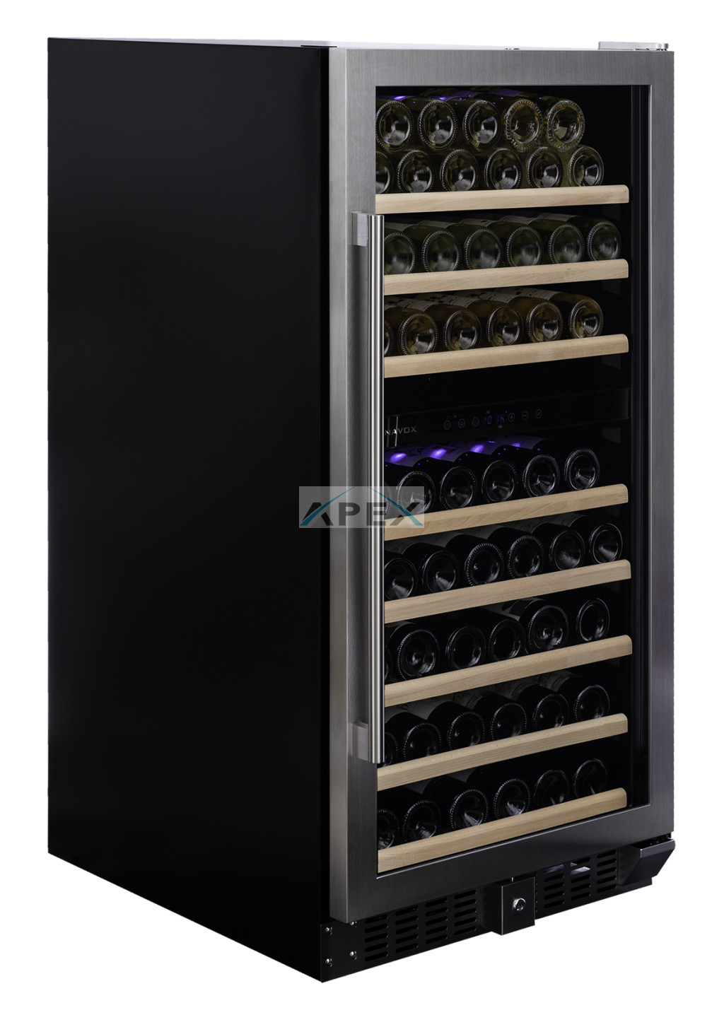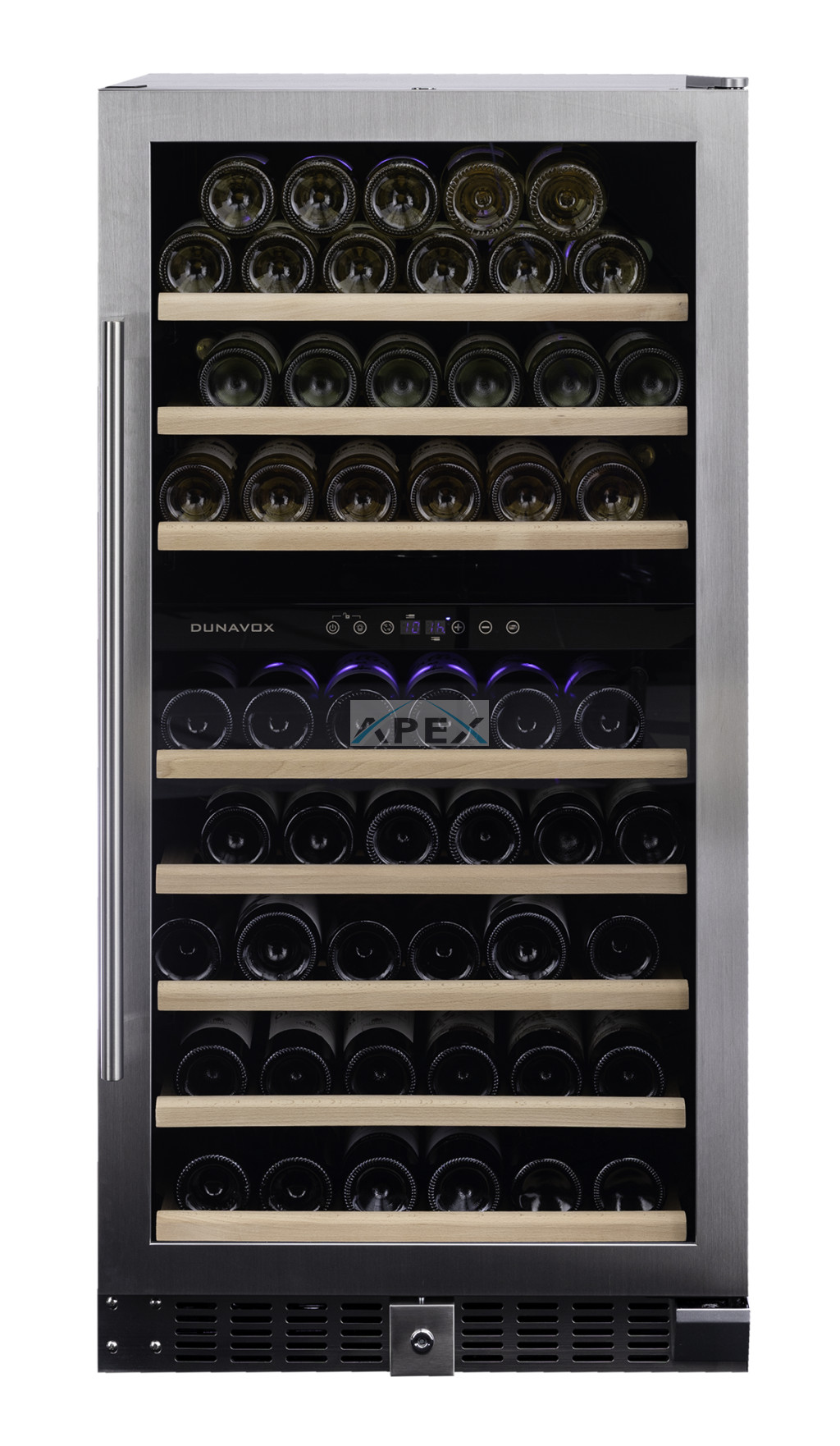 Kétszekciós, 94 palackos szabadon álló modell a Dunavox Grande sorozatból. A DUNAVOX Grande-94 elegáns, igényes belső és külső kialakításával – az SDSK változat rozsdamentes acél, a fekete pedig süllyesztett fogantyújával teszi igazán mutatóssá a modern konyhákat. A palackok tömör fa polcokon helyezhetőek el, melyeket kék LED világítás ölel körül. A felső zóna mindig legyen hidegebb, mint az alsó zóna. Felhívjuk figyelmét, hogy ez a modell egyaránt építhető konyhabútorba, vagy használható szabadon álló borhűtőként.