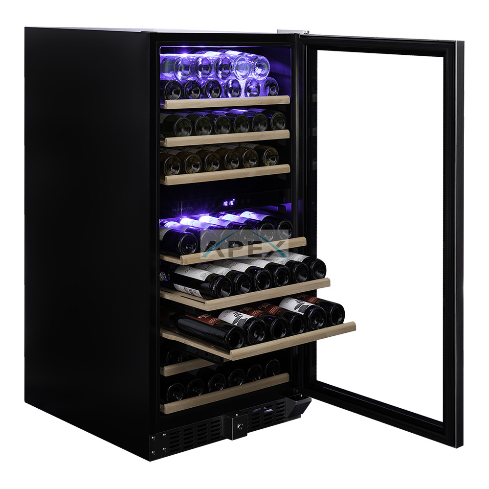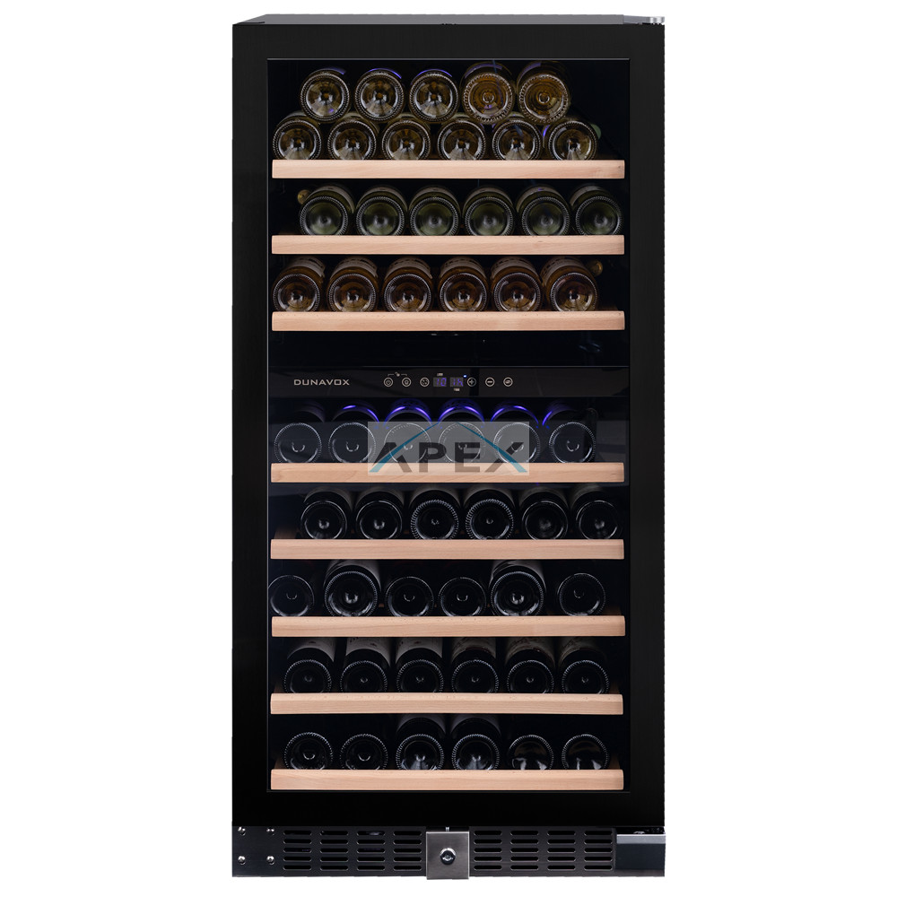 Kétszekciós, 94 palackos szabadon álló modell a Dunavox Grande sorozatból. A DUNAVOX Grande-94 elegáns, igényes belső és külső kialakításával – az SDSK változat rozsdamentes acél, a fekete pedig süllyesztett fogantyújával teszi igazán mutatóssá a modern konyhákat. A palackok tömör fa polcokon helyezhetőek el, melyeket kék LED világítás ölel körül. A felső zóna mindig legyen hidegebb, mint az alsó zóna. Felhívjuk figyelmét, hogy ez a modell egyaránt építhető konyhabútorba, vagy használható szabadon álló borhűtőként.