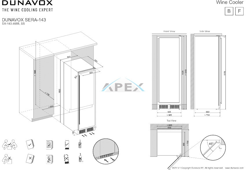 A DUNAVOX Sera-143 aktívan hűti le kedvenc pezsgős vagy proseccós palackjait, valamint hűvösen és frissen is tartja őket. Ideális 143 pezsgősüveg kényelmes tárolására. Egyszekciós, szabadon álló modell, elegáns külsővel és rozsdamentes acél fogantyúval. A palackok kihúzható speciális fém display polcokon helyezhetőek el, melyeket fehér, borostyánsárga vagy kék LED világítás ölelhet körül. Felhívjuk figyelmét, hogy ez a modell egyaránt építhető konyhabútorba, vagy használható szabadon álló borhűtőként.