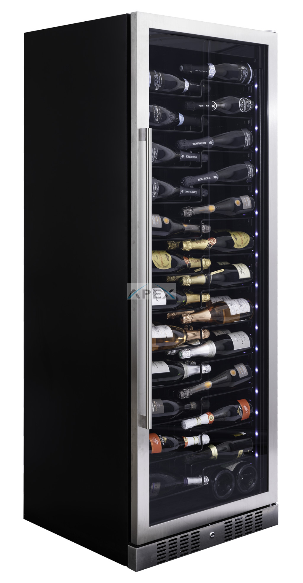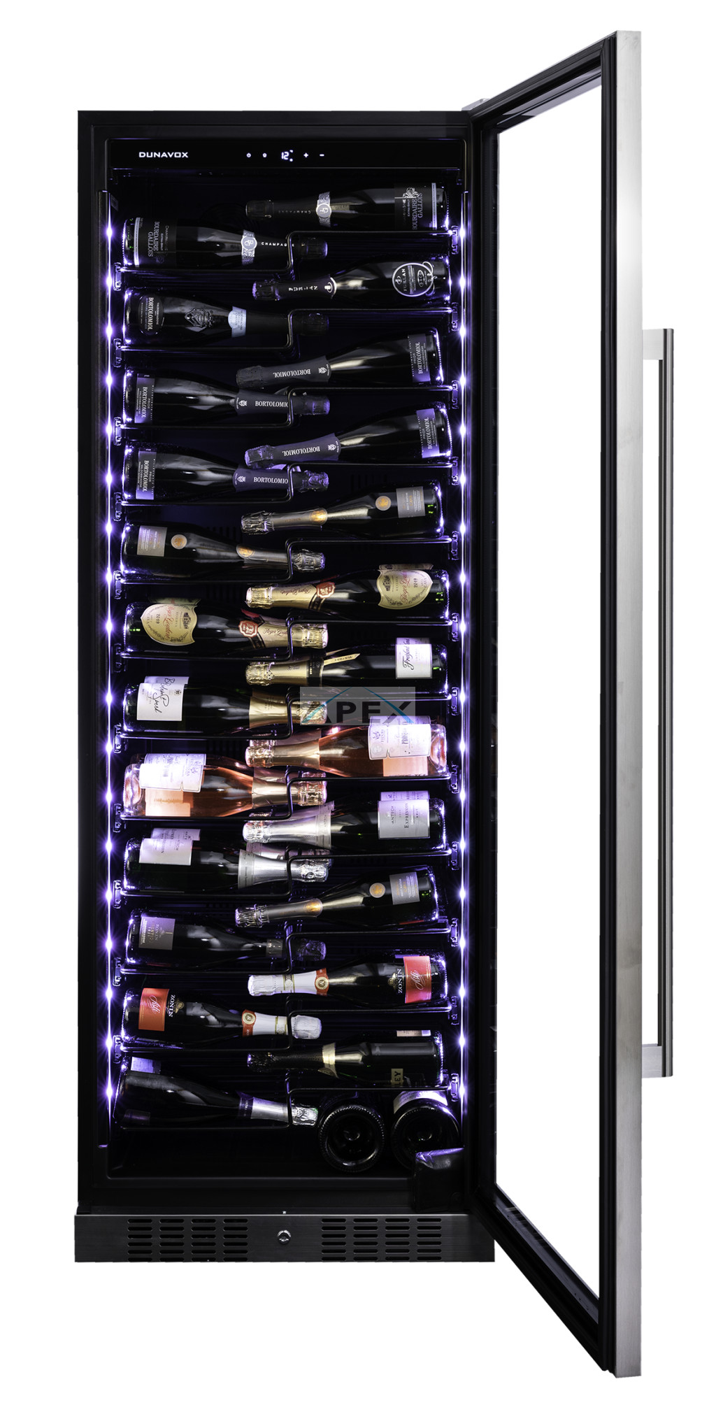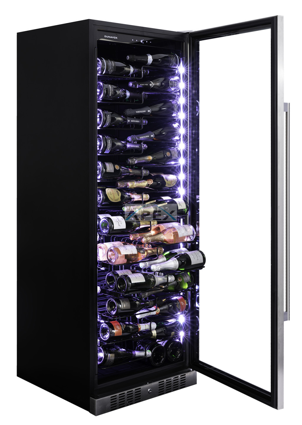 A DUNAVOX Sera-143 aktívan hűti le kedvenc pezsgős vagy proseccós palackjait, valamint hűvösen és frissen is tartja őket. Ideális 143 pezsgősüveg kényelmes tárolására. Egyszekciós, szabadon álló modell, elegáns külsővel és rozsdamentes acél fogantyúval. A palackok kihúzható speciális fém display polcokon helyezhetőek el, melyeket fehér, borostyánsárga vagy kék LED világítás ölelhet körül. Felhívjuk figyelmét, hogy ez a modell egyaránt építhető konyhabútorba, vagy használható szabadon álló borhűtőként.