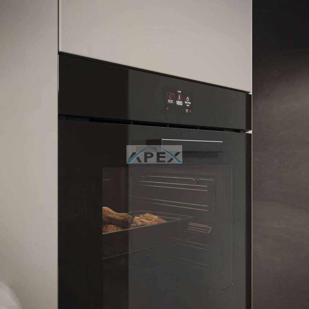 A Virtus Multi 60 TFT Pyro BL sütő kifinomult, fekete üveg kivitelével és minimalista vonalaival bármely konyhában eleganciát sugároz. Az esztétikus, letisztult megjelenés nemcsak vizuálisan emeli a teret, hanem könnyen illeszkedik a modern és klasszikus konyhabútorokhoz egyaránt.