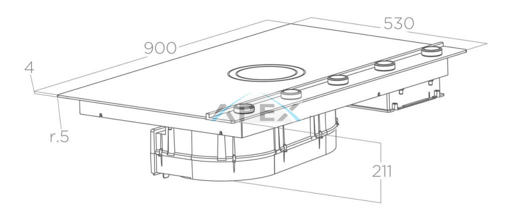 A konyhabútor lábazatából ki. Az EVO választékban lévő modellek mindegyike rendelkezik a jobb oldalán hátul elhelyezett légkivezető nyílással. Ez a készlet lehetővé teszi, hogy a készüléket szűrős (belső keringtetéses) üzemmódban telepítse, és a megtisztított levegőt egy speciális tölcsér alakú csatornával (amely a szellőzőnyílás elegáns díszítésével végződik) a lábazaton keresztül kifelé vezesse.