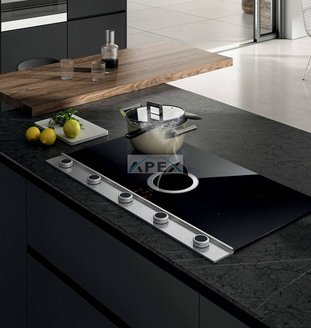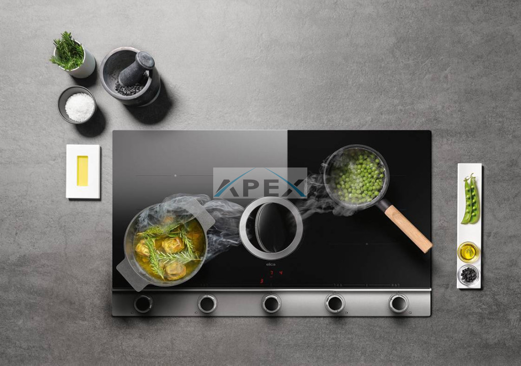 Ready to play? Végre teljesen ergonomikus és intuitív módon főzhet. Mindig kézreeső, a legmodernebb funkciókkal és vezérlőkkel rendelkező különleges markolatú, analóg touch & feel gombok jellemzik ezt a páraelszívós főzőlapot mely elválasztja a főzőzónát a vezérlőfelülettől (válaszfallal védett). A középső üveg- és fémcsap elrejti a szívóterületet, ami a terméknek különleges hatású linearitást kölcsönöz. A levegő mindig tiszta az újonnan kifejlesztett  kombinált szag- zsír és nedvességszűrőnek köszönhetően, amelyet úgy terveztek, hogy karbantartása egyszerű legyen. A legkorszerűbb motorok még maximális teljesítmény mellett is alacsony zajszintet és alacsony fogyasztást biztosítanak. Többek között vajat vagy csokoládét olvaszthat, anélkül, hogy folyamatosan kevergetnie kellene; optimalizálhatja a lassú főzést; a heves forralás során elkerülheti a forró víz kifolyását. Továbbá a nagyobb edényekben történő egyenletes főzés érdekében két szomszédos főzőzónát is aktiválhat egyszerre.