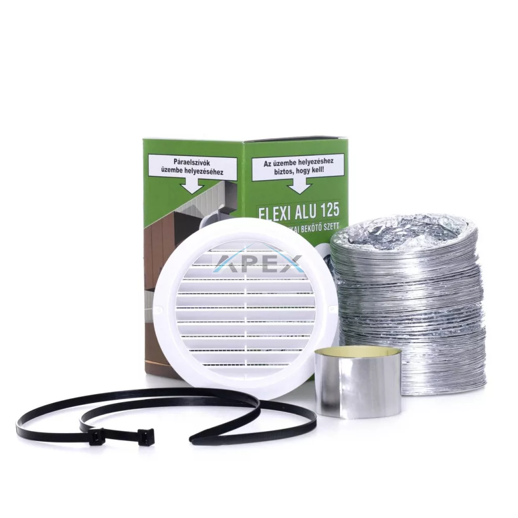 3 méter 125 mm átmérőjű flexibilis ALU cső, 2 db rögzítő bilincs, 2 db légtechnikai rögzítő szalag, 1 db 125 mm átmérőjű kerek fix rács