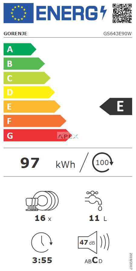 Energiaosztály A-tól (hatékony) G-ig (kevésbé hatékony) terjedő skálán: E