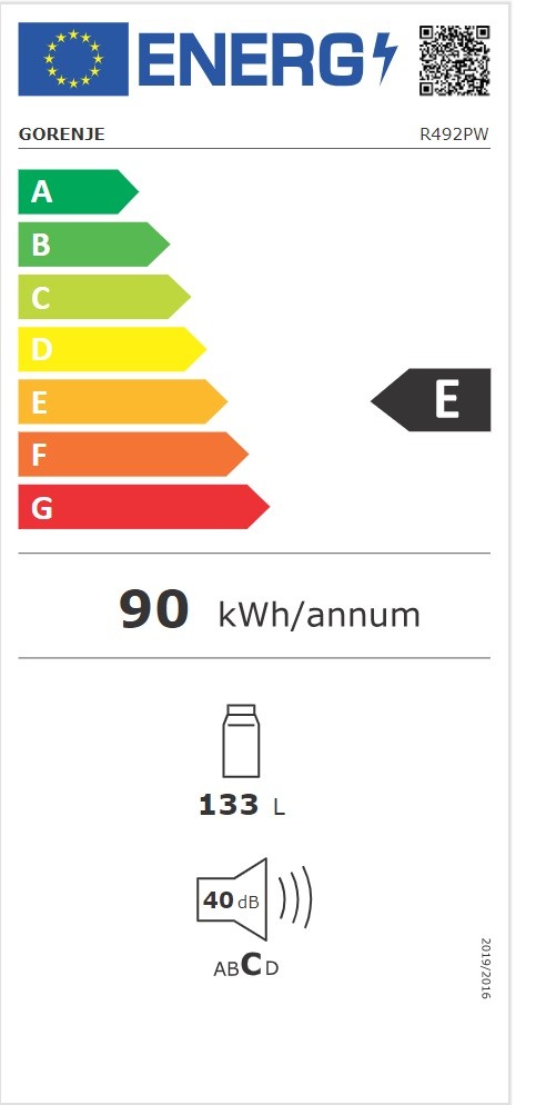 Energiaosztály A-tól (hatékony) G-ig (kevésbé hatékony) terjedő skálán: E