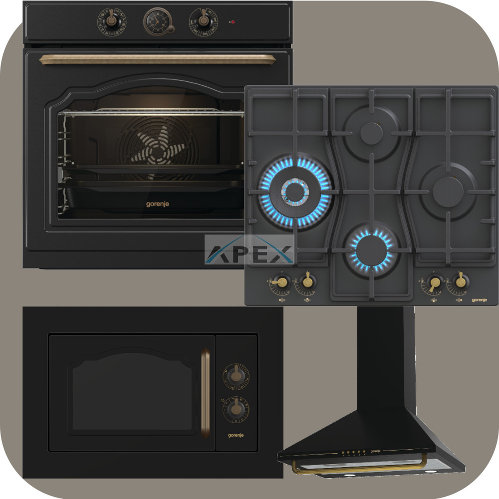 Gorenje Classico BOS67372CLB hőlégkeveréses sütő + GW6D42CLB gáz főzőlap + BM235CLB grilles mikrohullámú sütő + WHC63CLB Kürtős páraelszívó fekete színben