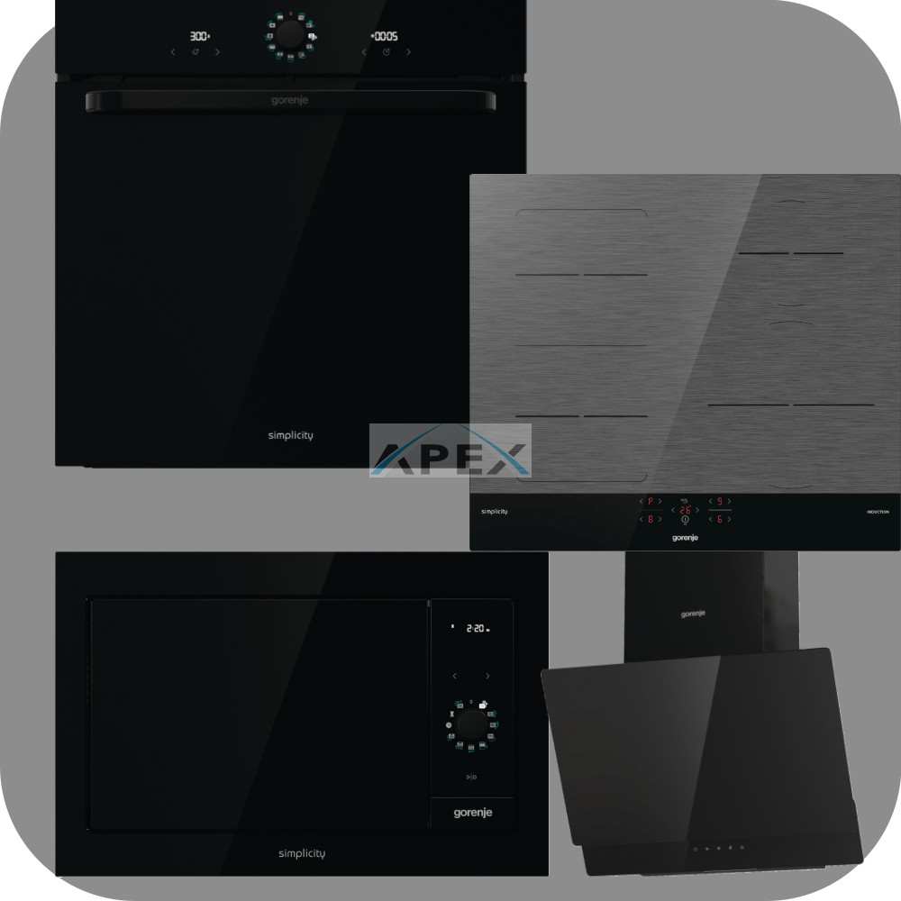 Gorenje Simplicity BOS6737SYB hőlégkeveréses sütő + GI6421SYB indukciós főzőlap + BM235G1SYB grilles mikrohullámú sütő + WHI649EB Döntött fali páraelszívó fehér színben