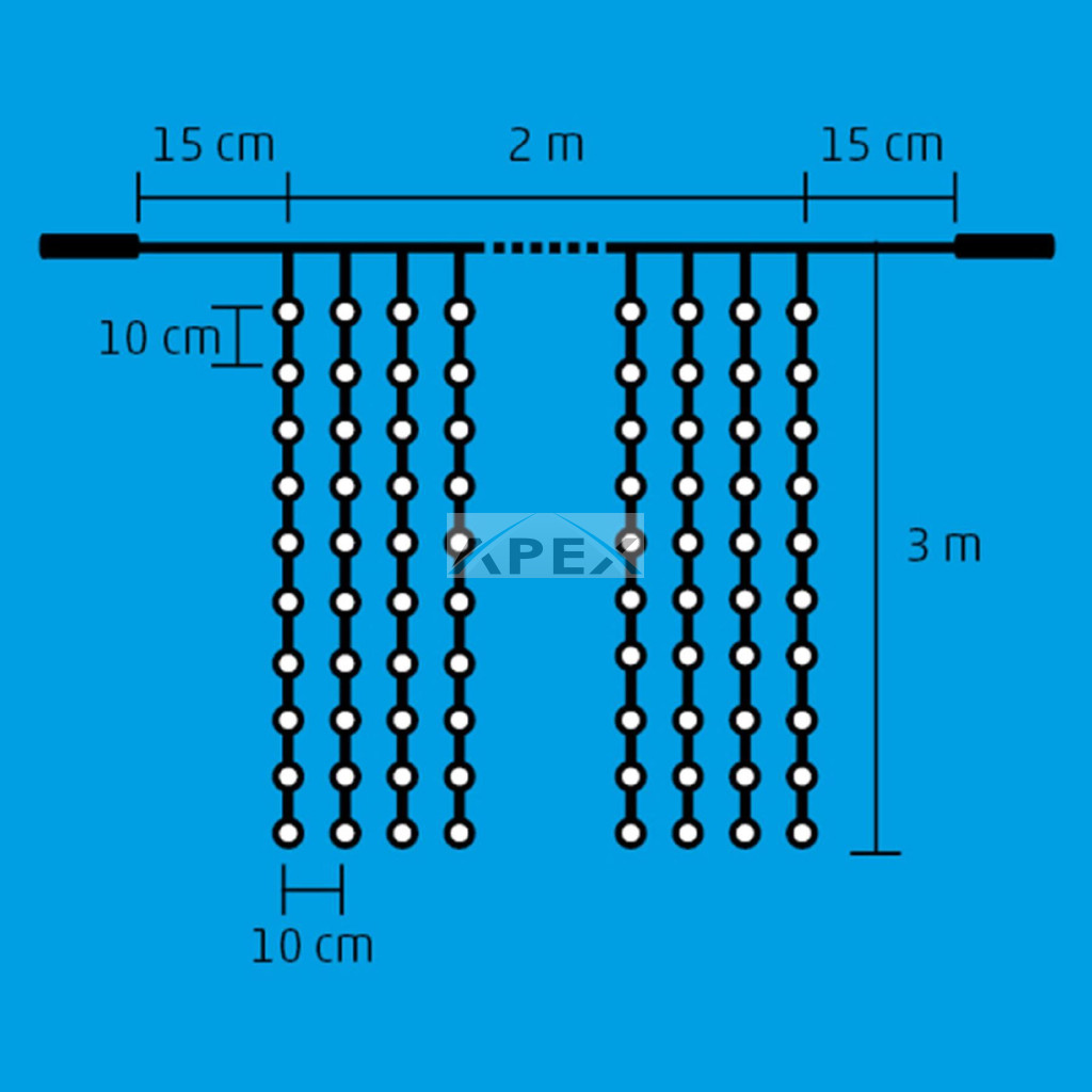 Ez a fényfüggöny 2 x 3 méteres méretben, 600 hidegfehér LED-del ragyogja be a teret, így ideális választás lehet karácsonyi dekorációként vagy bármely más különleges alkalomra. A 20 füzérből álló LED-es fényfüggöny minden egyes füzéren 30 LED-del rendelkezik, amelyek állófényű fényt biztosítanak. A fehér vezeték diszkréten beleolvad a háttérbe, így a figyelem teljes mértékben a ragyogó fényekre összpontosul.
