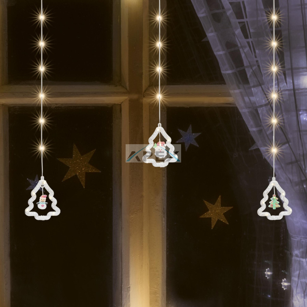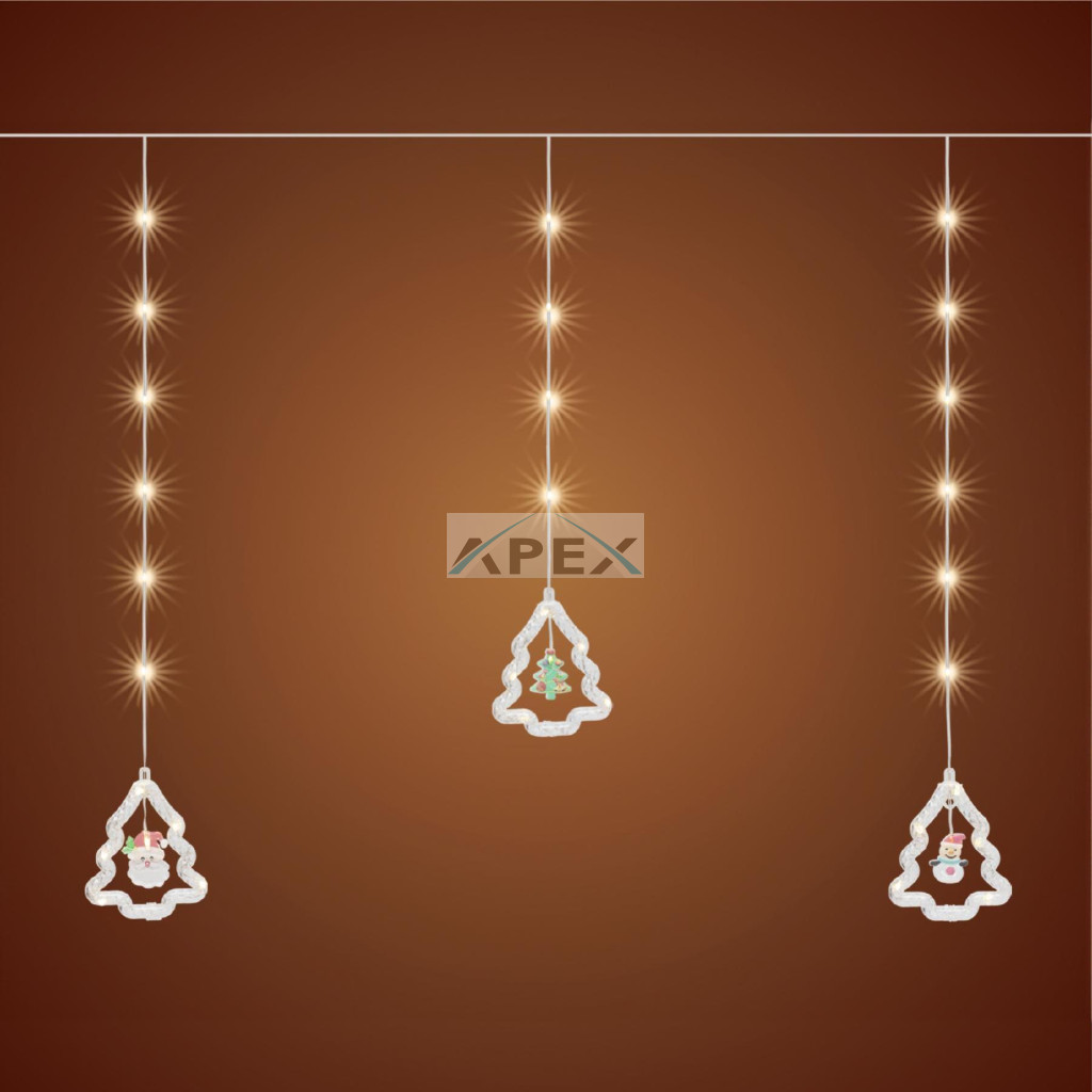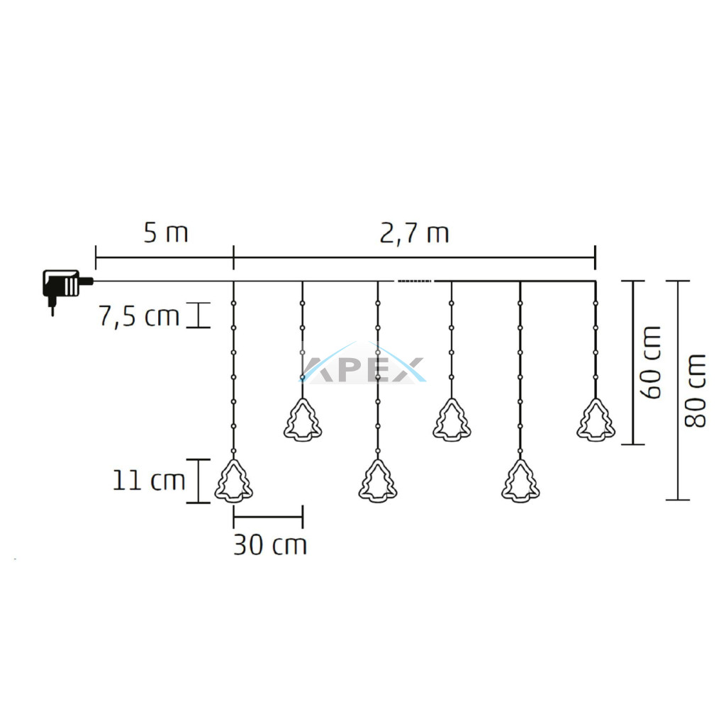 A fényfüggöny világítási módja állandó, így folyamatos meleg fényárban úszik. A 2,7 méter hosszú füzért 5 méteres tápkábel követi az adapterig, amely IP44-es kültéri védelemmel rendelkezik, biztosítva a biztonságos használatot bármilyen időjárási körülmények között. A füzérek közti távolság 30 cm, míg a fenyő figura magassága 11 cm. A gerinctől a lelógások hossza a figurák aljáig 60 cm és 80 cm, ami lenyűgöző látványt nyújt.