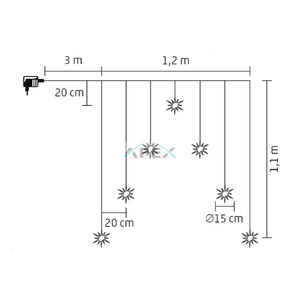 szélesség: 1,2 m • füzérek közti távolság: 20 cm • legmélyebb lelógás a gerinctől (alsó csillag közepe): 1,1 m • legkisebb lelógás a gerinctől (felső csillag közepe): 20 cm • hópehely mérete: Ø15 cm