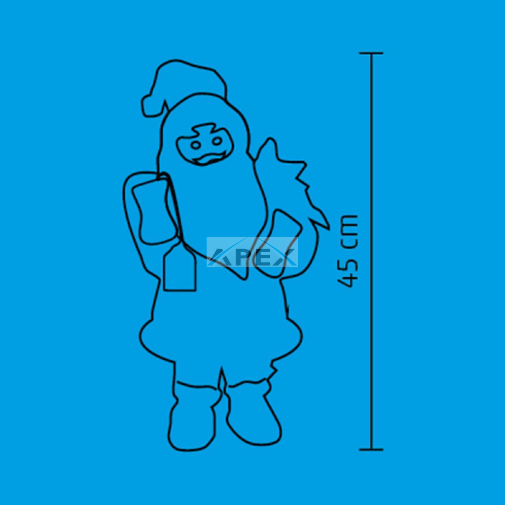A 45 cm magas Mikulás figura látványos méretével, zenére mozgó vidám mozdulataival és kellemes hangulatot árasztó dallamaival garantáltan az ünnepi dekoráció egyik legszórakoztatóbb eleme lesz. A beltéri kivitelű figura 3 darab 1,5 V-os AA elemmel működik (nem tartozék), így bárhol elhelyezheti otthonában, ahol szükség van egy kis extra vidámságra és karácsonyi hangulatra. A Mikulás tökéletesen illik a nappaliba, a gyerekszobába vagy akár az előszobába is, ahol táncával mindenkit meglep és szórakoztat.