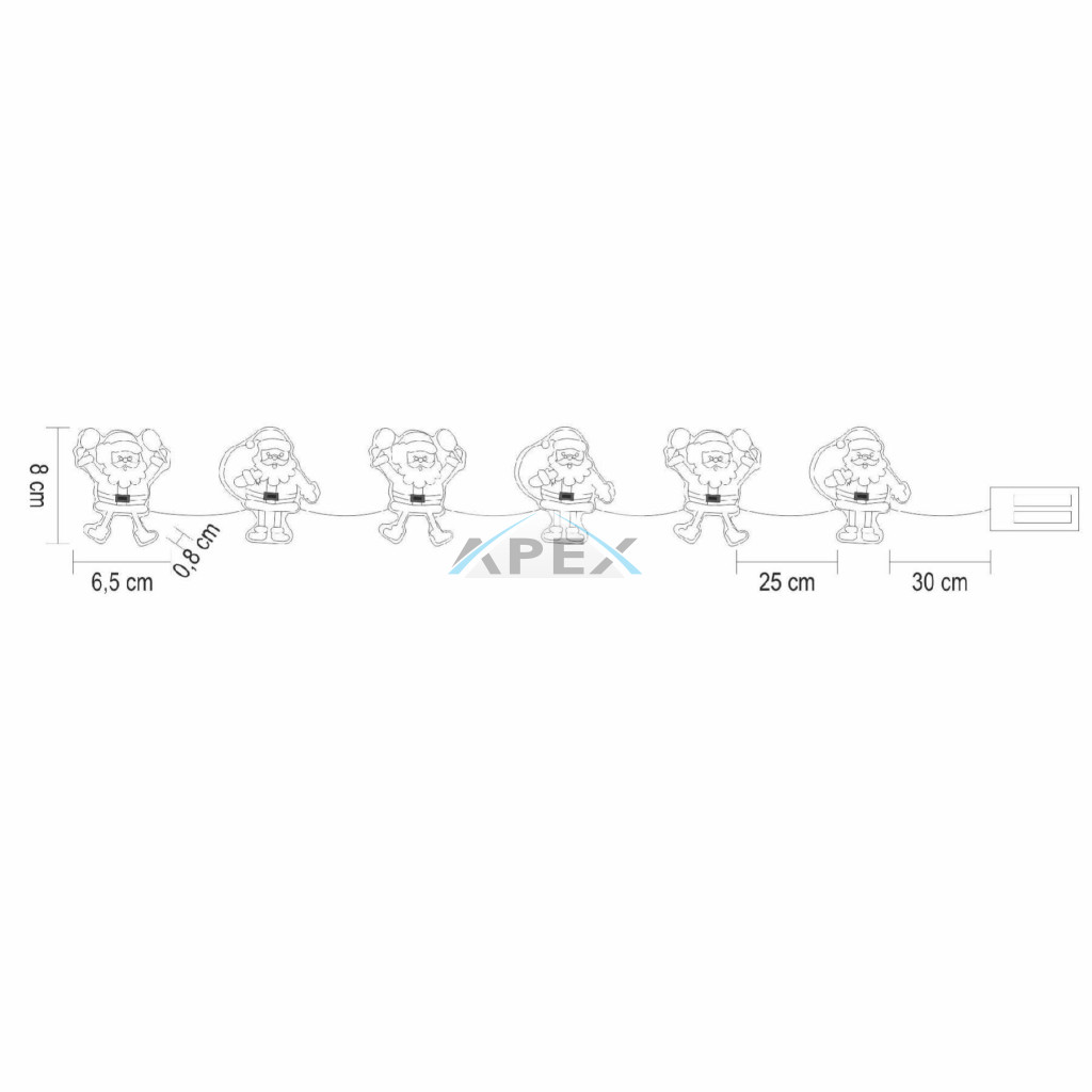 A dekorációt alkotó hat mikulásfigura puha szilikon anyagból készült, így nemcsak látványos, hanem biztonságos is – ideális választás kisgyermekes családok számára. A figurák mérete 6,5 × 0,8 × 8 cm, egymástól való távolságuk 25 cm, ami szellős, jól elosztott elrendezést biztosít. A teljes vezeték hossza 30 cm, így könnyen elhelyezhető ablakpárkányon, polcon, falon vagy akár asztali dekoráció részeként is.