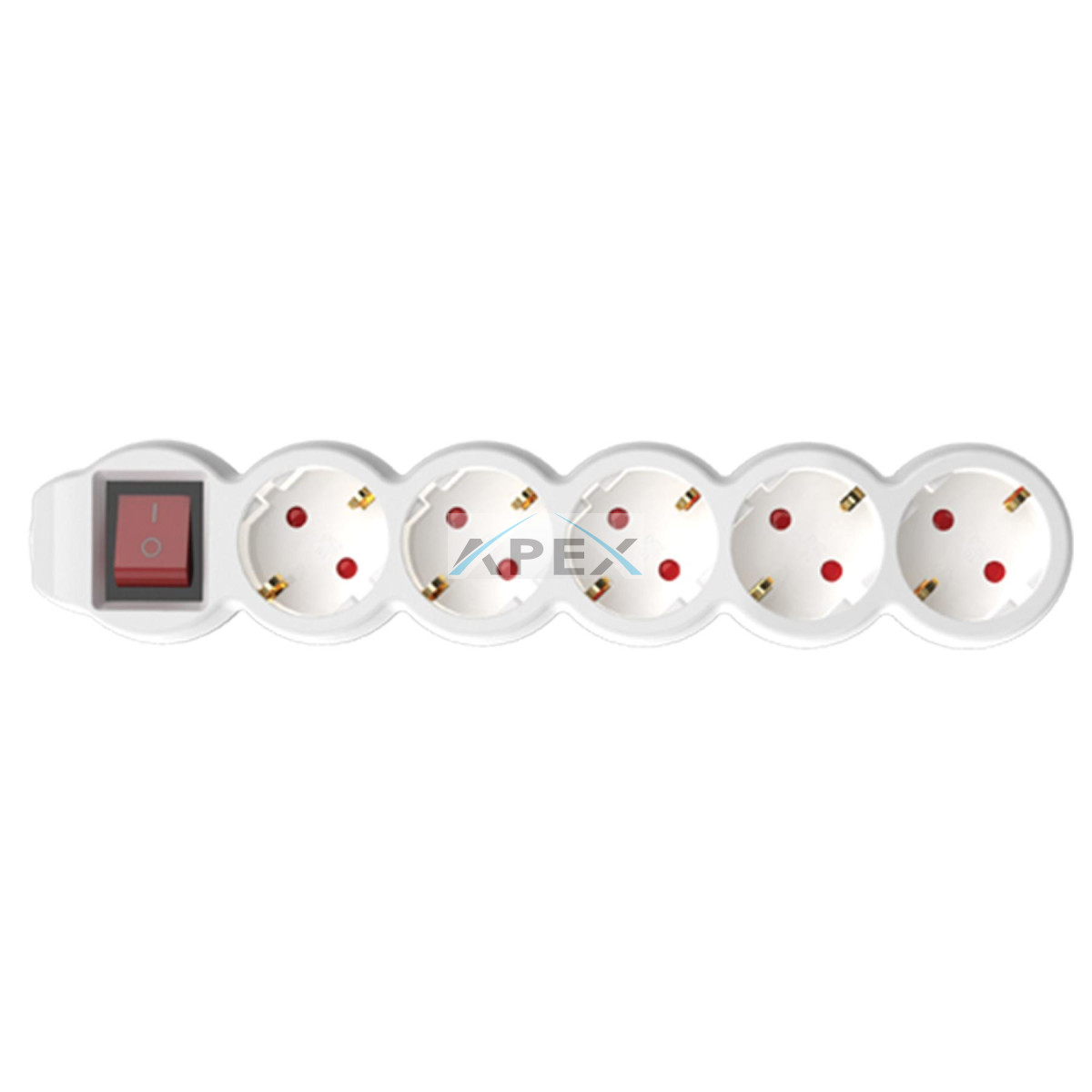 Az NV 5K-3/WH/1,5 Kapcsolós hálózati elosztó 5 db aljzattal ellátott, melyet egy fő kapcsolóval áramtalanítani tud. A biztonságos használat érdekében IP 20 védelemmel és gyermekvédelemmel ellátott. A fehér színű elosztó 3 m hosszú H05VV-F 3G1,5 mm2 kábellel felszerelt. Maximum 3500 W-ig terhelhető.