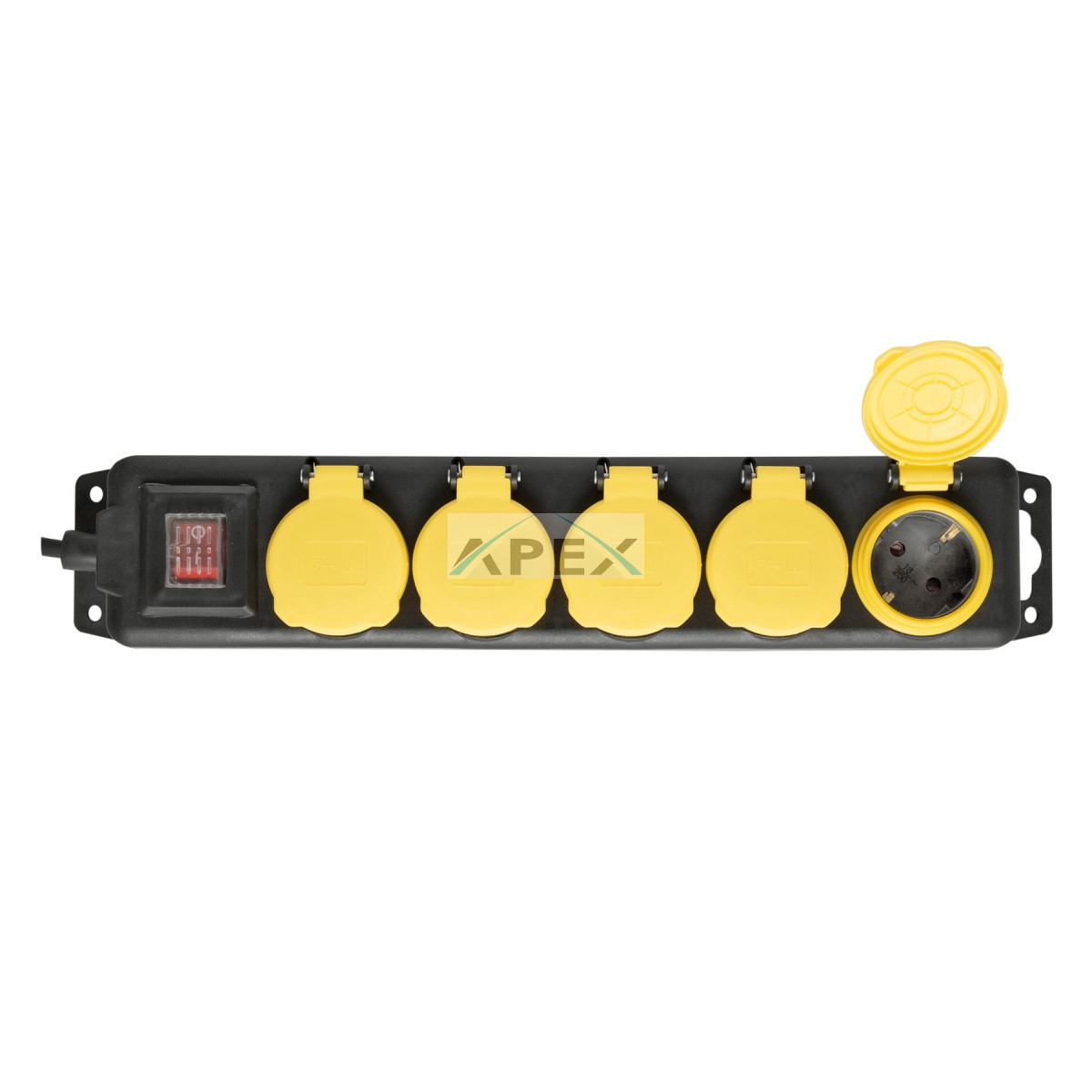 Az NVO 05K-5/BK/1,5 Hálózati elosztó kapcsolós, masszív, kültéri kivitelben készült 5 m hosszú H05RR-F 3G1,5 mm² fekete gumikábellel. A termék IP 44 védettségű, a zárófedeles aljzatok által kültéren is biztonsággal használható. Az elosztó 5 db gyerekvédelemmel ellátott, 250 V-os aljzattal felszerelt. Maximum 3000 W-ig terhelhető.