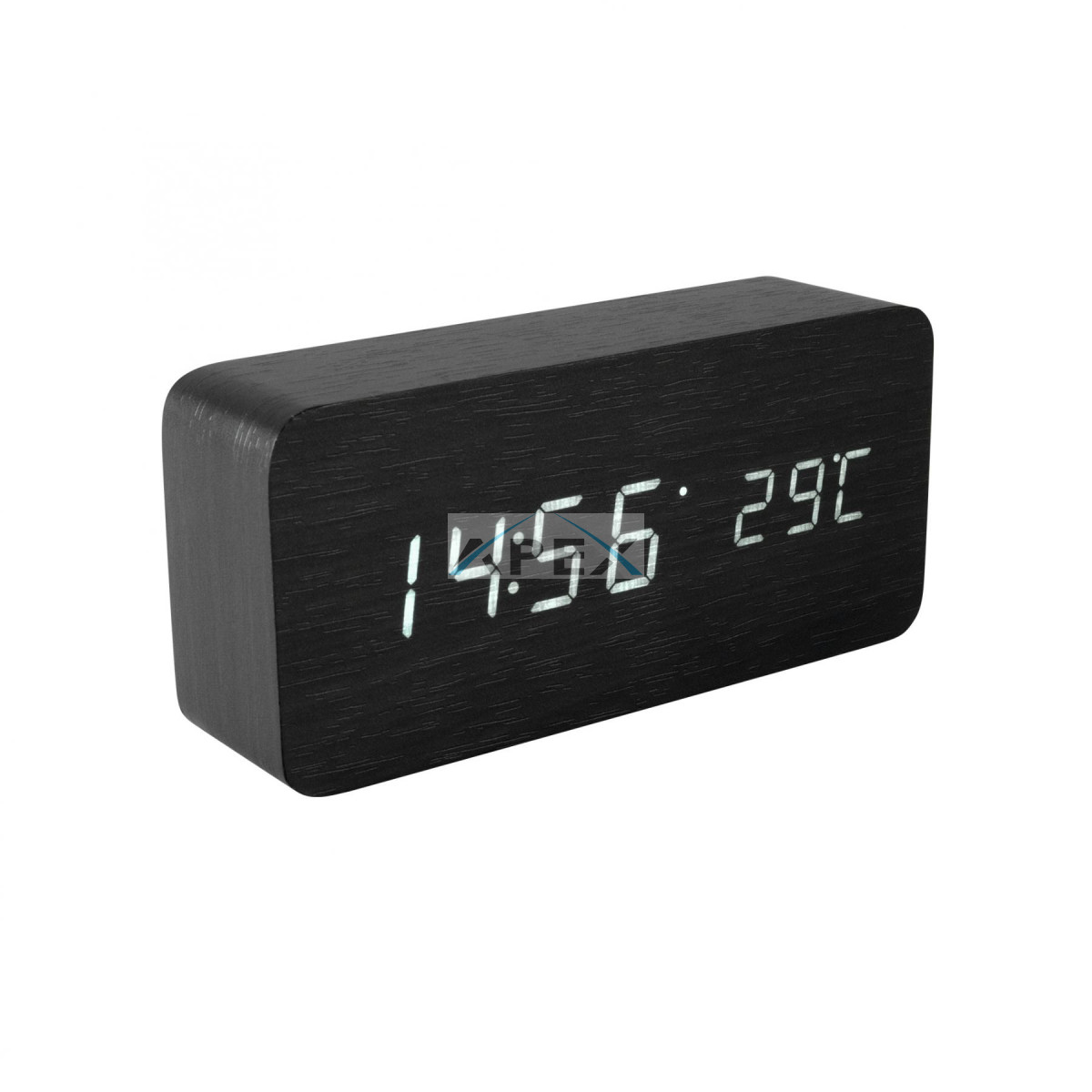 Home OC 04 digitális LED ébresztőóra, valódi faburkolat, tapsra aktiválható fehér kijelző, dátum és hőmérséklet kijelzés, elemes vagy hálózati tápellátás