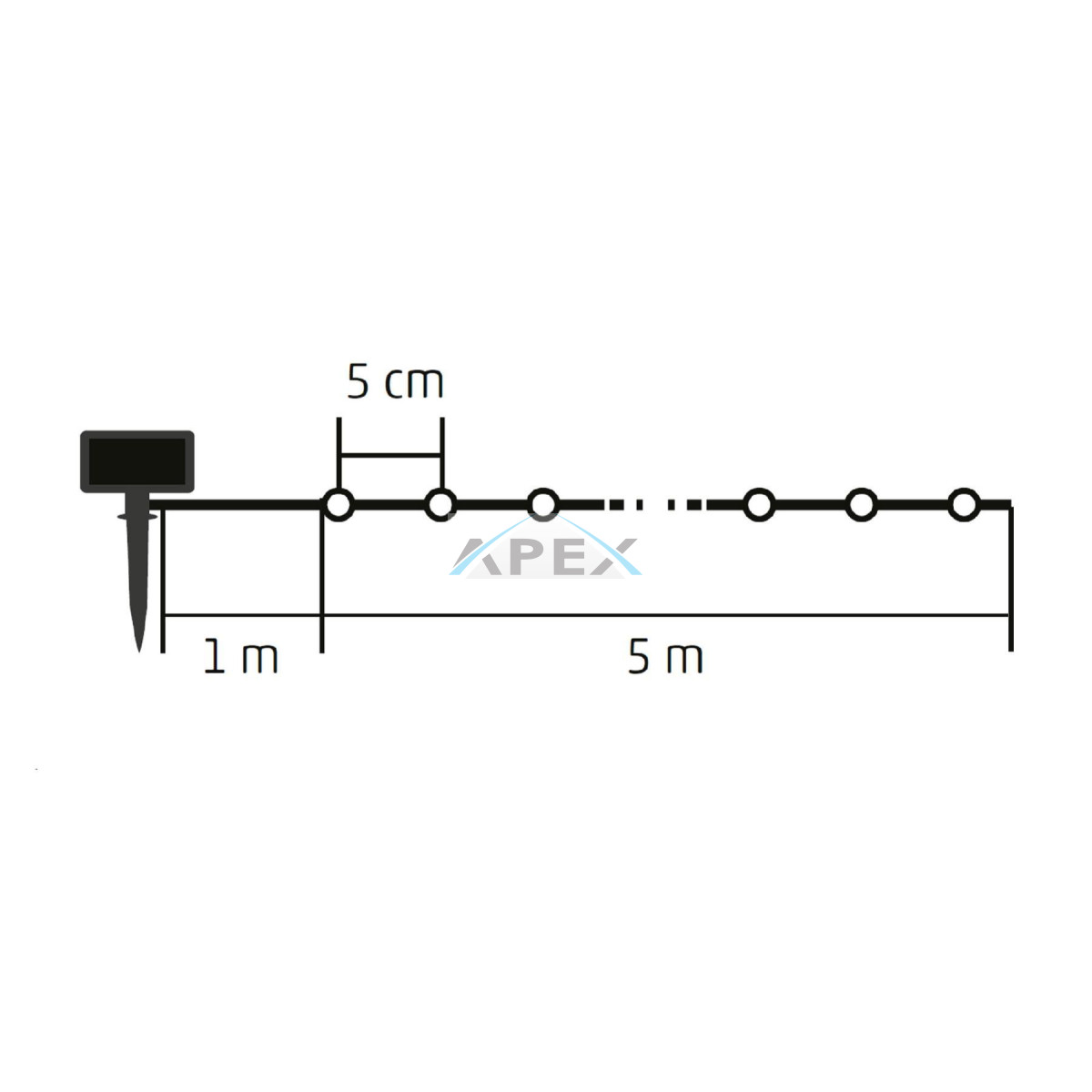 5 m füzérhossz (LED-ek távolsága: 5 cm) + 1 m tápkábel a szolár panelig