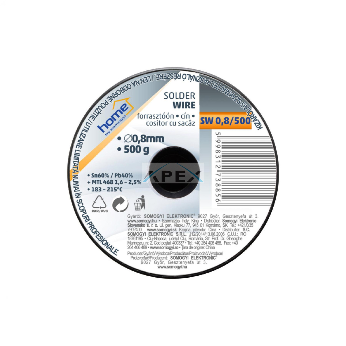 Home SW 0,8/500 forrasztóón, 0,8mm, 500g, európai gyártótól származó kiváló minőségű forrasztóón, összetétel: SN/PB: 60/40%, gyanta: 2,0%